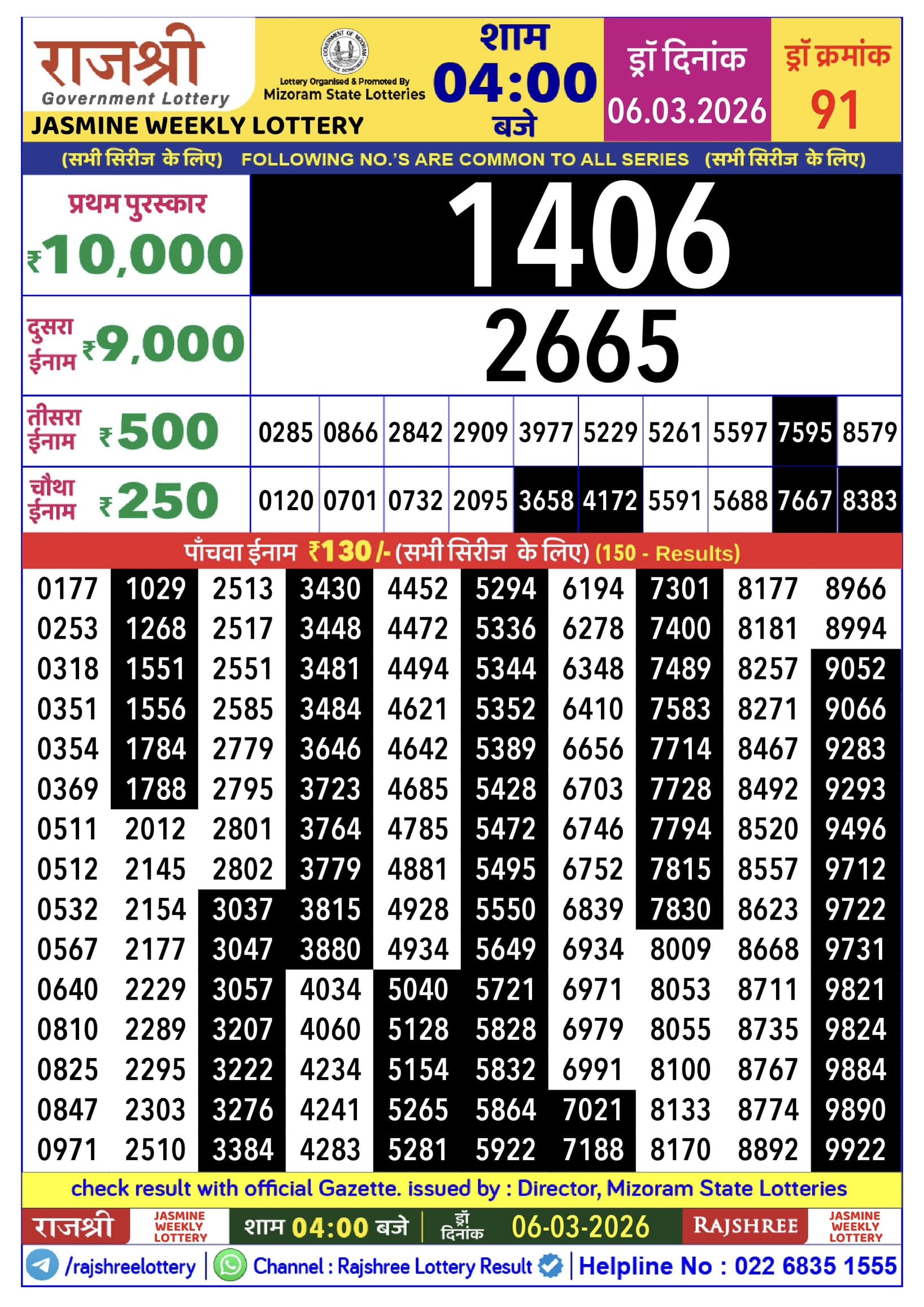 Maharashtra Gajlaxmi Guru Weekly Draw 30.10.2025 Result 4.45pm 0 Likes 151 Views Related Articles 0 99Nagaland State Dear Special Bumper 2025 Lottery 6PM Result 22.11.2025 0 49Rajshree 50 Mangal Weekly Lottery 31.03.2026 Result 7.30 PM 0 109Punjab State Dear 50 Beast Monday 6pm Lottery Result 17.11.2025 0 81Golden 200 Gold Monthly Lottery 21.01.2026 Result 6.30pm
