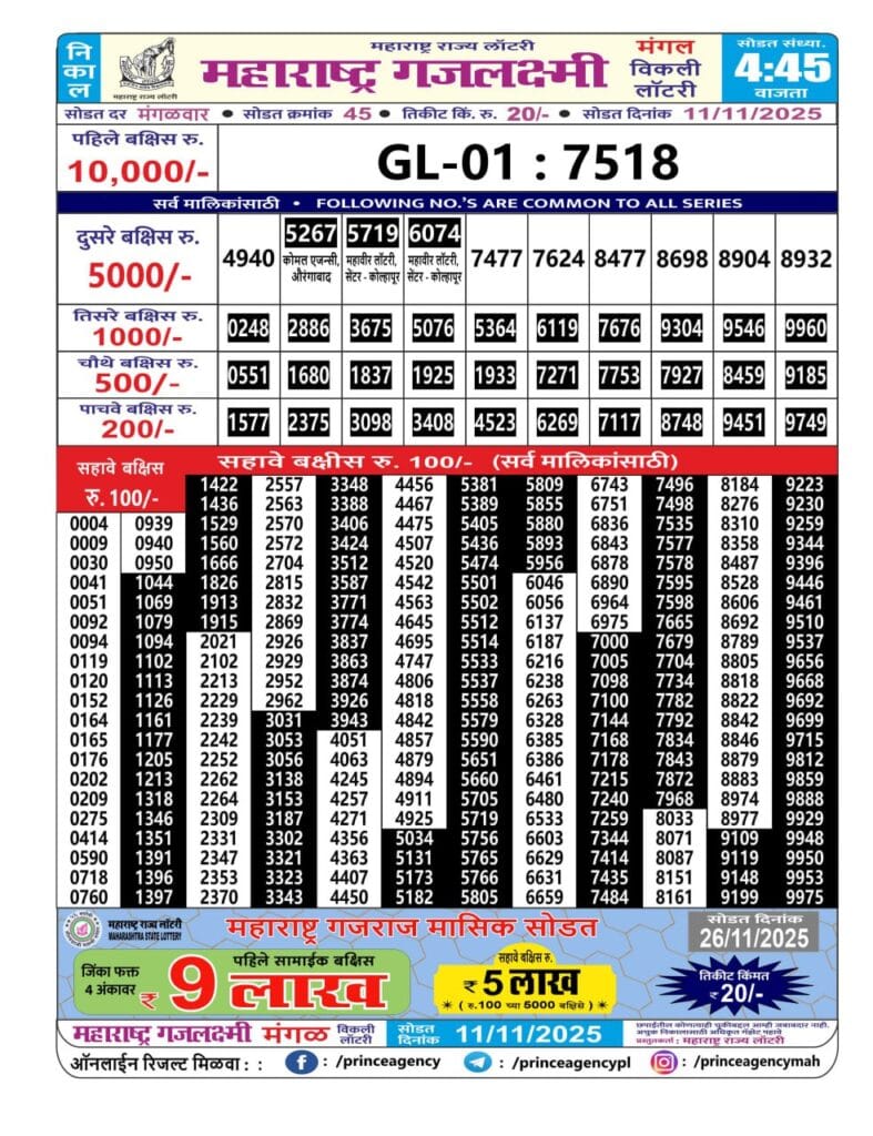 Maharashtra Gajlaxmi Mangal Weekly Draw 11.11.2025 Result 4.45pm 0 Likes 145 Views Related Articles 0 19Maharashtra Ganeshlaxmi Gaurav Weekly Draw 09.04.2026 Result 5 PM 0 68Maharashtra Ganeshlaxmi Samruddhi Weekly Draw 28.02.2026 Result 5 PM 0 51Maharashtra Sahyadri Dhanlaxmi Weekly Draw 16.02.2026 Result 4.30 PM 0 155Maharashtra Gajlaxmi Ravi Weekly Draw 23.11.2025 Result 4.45pm