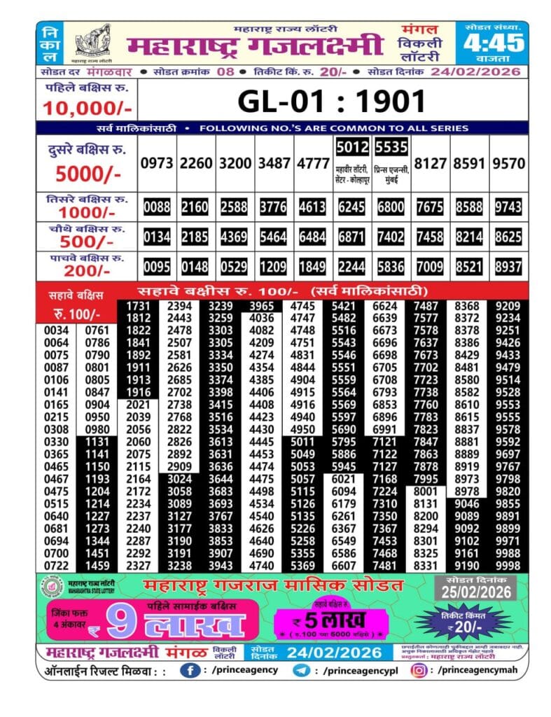 Maharashtra Gajlaxmi Mangal Weekly Draw 24.02.2026 Result 4.45 PM 0 Likes 69 Views Related Articles 0 82Sikkim State Labhlaxmi Power Sunday Weekly Lottery 8.2.2026 Result 4 PM 1 97Punjab State Dear 50 Chief Thursday 6pm Weekly Lottery 13 November 2025 0 102Maharashtra Vaibhavlaxmi Weekly Draw Result 09.01.2026 0 281Punjab State Dear Baisakhi Bumper 2026