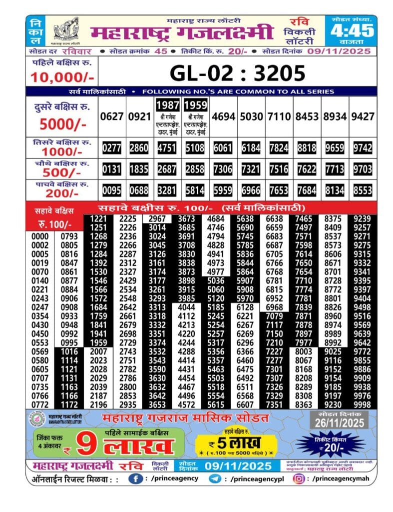 Maharashtra Gajlaxmi Ravi Weekly Draw 09.11.2025 Result 4.45pm 0 Likes 101 Views Related Articles 0 26Rajshree 50 Ravi Weekly Lottery 15.02.2026 Result 7.30pm 0 77Punjab State Dear 50 Chief Thursday 6pm Lottery Result 20.11.2025 0 91Punjab State Dear 50 Bronco Tuesday 6pm Lottery Result 16.09.2025 0 50Maharashtra Tejaswini (Monthly) Weekly Draw Result 23.01.2026