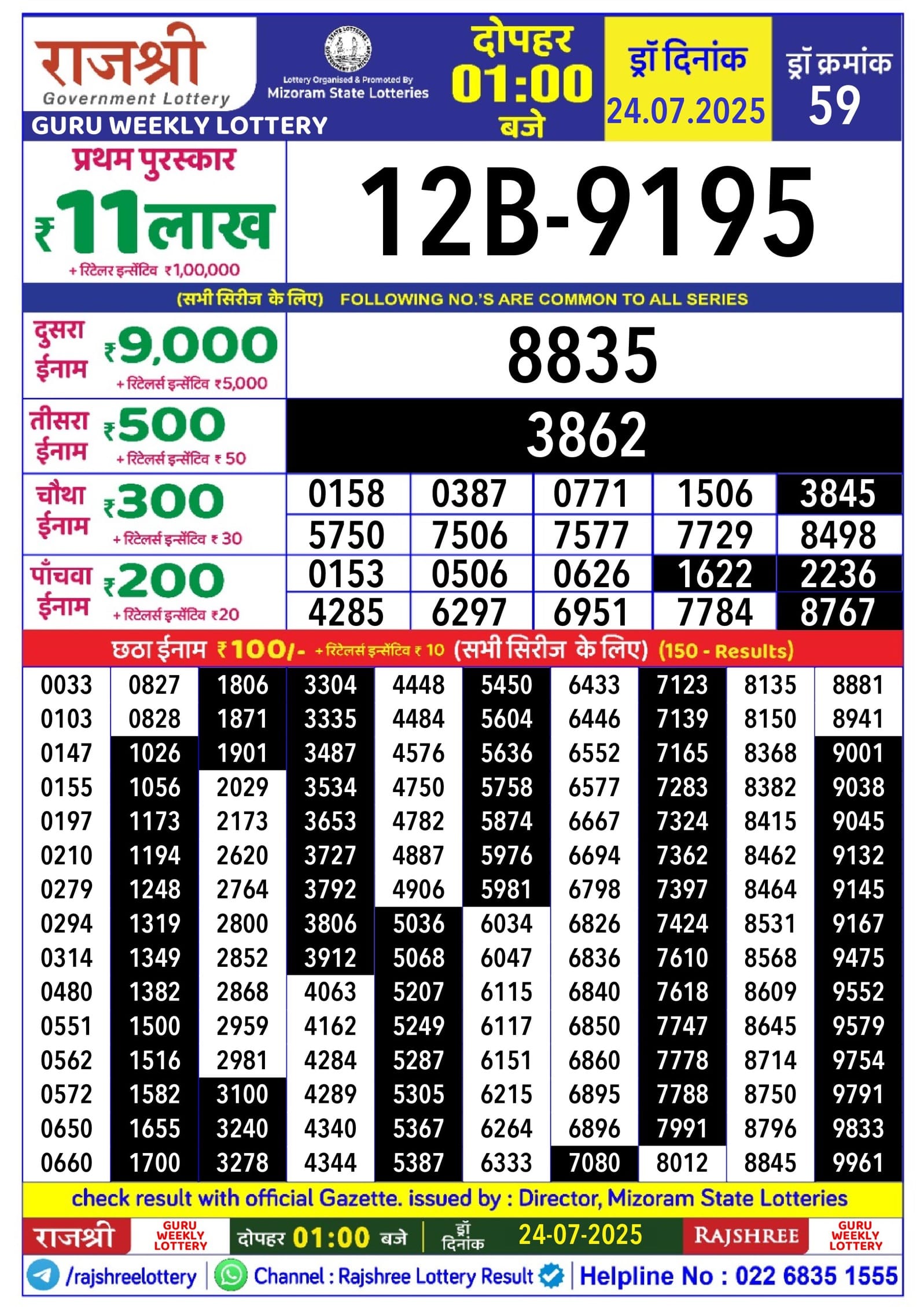 Maharashtra Gajlaxmi Ravi Weekly Draw 14.12.2025 Result 4.45pm 0 Likes 39 Views Related Articles 0 55goa state rajshree 250 monthly lottery 7 october 2025 at 6.30pm 0 46Maharashtralaxmi Weekly Draw Result 29.11.2025 0 84Maharashtra Sahyadri Vijayalaxmi Weekly Draw 22.10.2025 Result 4.30pm 0 76Rajshree Guru Thursday Weekly Lottery 1PM Result 24.07.2025
