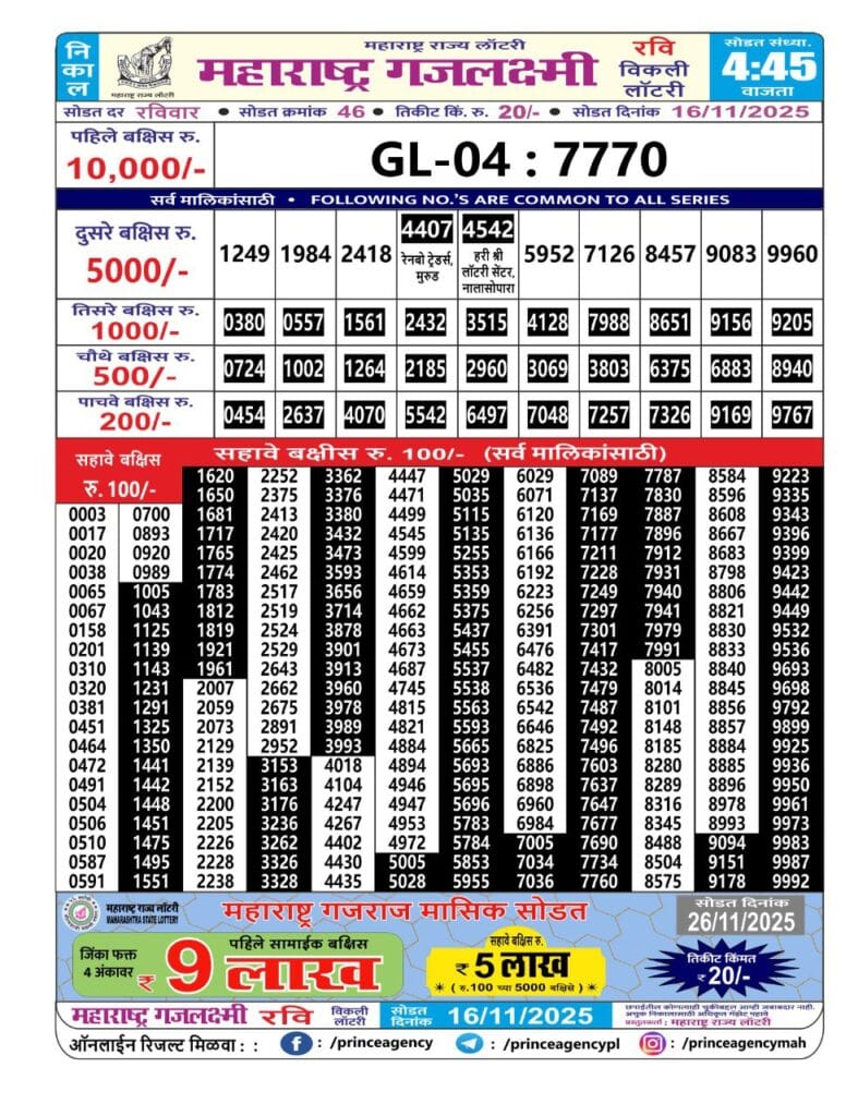 Maharashtra Gajlaxmi Ravi Weekly Draw 16.11.2025 Result 4.45pm