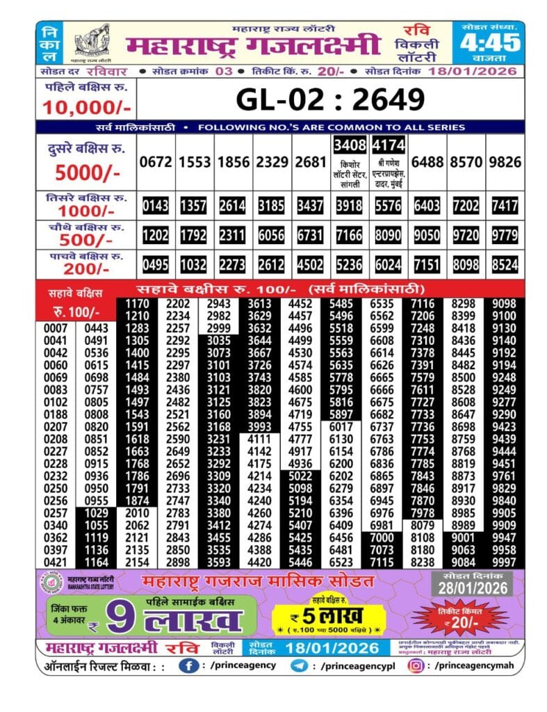Maharashtra Gajlaxmi Ravi Weekly Draw 18.01.2026 Result 4.45pm