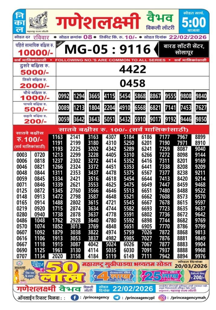 Maharashtra Ganeshlaxmi Vaibhav Weekly Draw 22.02.2026 Result 5 PM 0 Likes 2 Views Related Articles 0 93Maharashtra Akshay Weekly Draw Result 28.01.2026 0 167Maharashtra Ganeshlaxmi Samruddhi Weekly Draw 15.11.2025 Result 5pm 1 104Mizoram State Golden Ganpati Bumper 1.9.2025 Lottery 6.15 PM 1 102Punjab State Dear 50 Buster Wednesday 6pm Lottery Result 27.08.2025