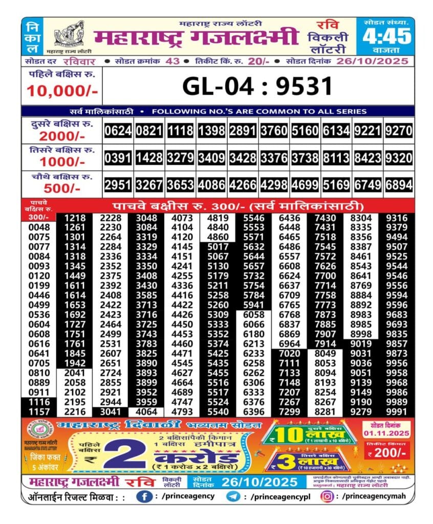 Maharashtra Gajlaxmi Ravi Weekly Draw 26.10.2025 Result 4.45pm 0 Likes 65 Views Related Articles 0 3Maharashtra Gajlaxmi Budh Weekly Draw 24.12.2025 Result 4.45pm 0 65Maharashtra Gajlaxmi Ravi Weekly Draw 09.11.2025 Result 4.45pm 0 65Maharashtra Gajlaxmi Shani Weekly Draw 15.11.2025 Result 4.45pm 0 59Maharashtra Ganeshlaxmi Vaibhav Weekly Draw 09.11.2025 Result 5pm
