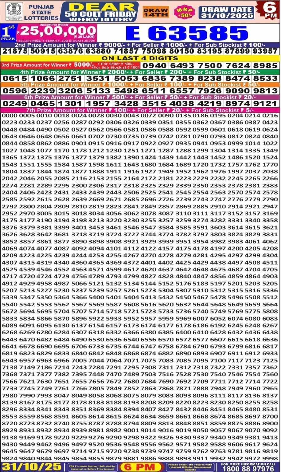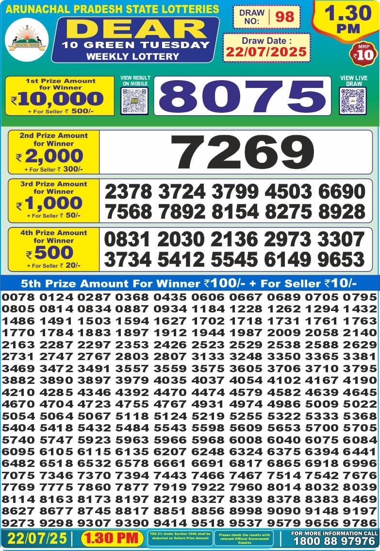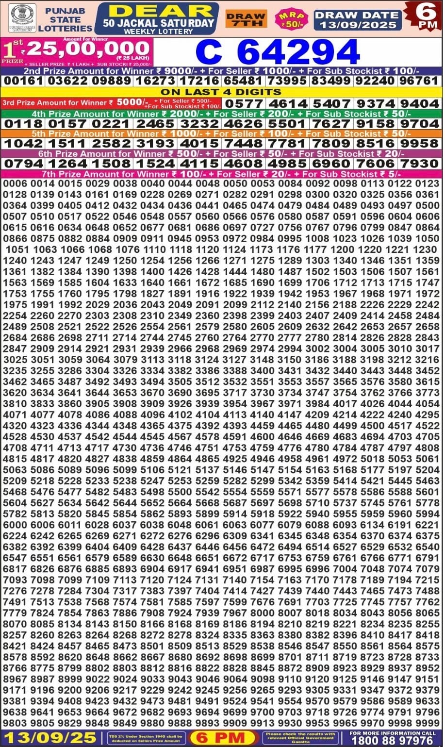 Maharashtra Gajlaxmi Shani Weekly Draw 20.12.2025 Result 4.45pm 0 Likes 28 Views Related Articles 0 47Punjab State Dear 50 Beast Monday Weekly Lottery 24.11.2025 At 6 PM 0 75Maharashtra Akarshak Pushkaraj Weekly Draw Result 11.12.2025 0 45Dear 10 green lottery 1.30PM Result 22.07.2025 2 97Punjab State Dear 50 Colt Friday 6pm Lottery Result 31.10.2025