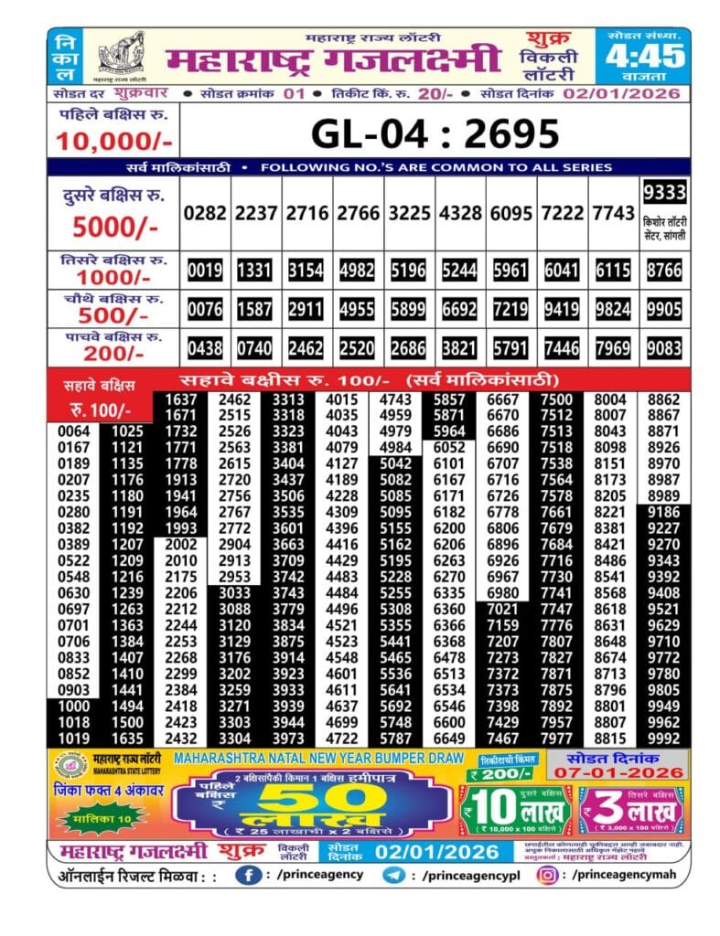 Maharashtra Gajlaxmi Shukra Weekly Draw 02.01.2025 Result 4.45 PM