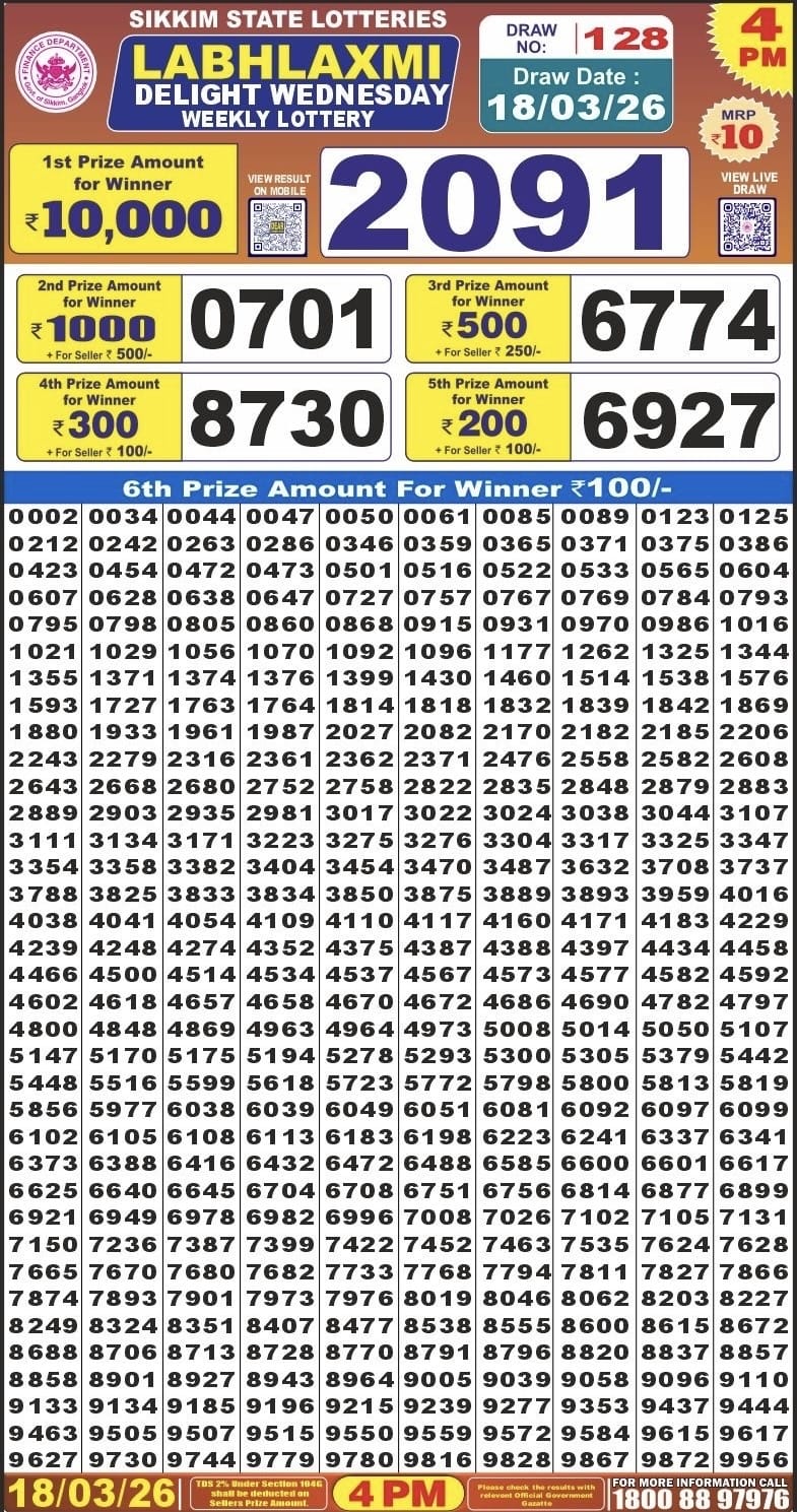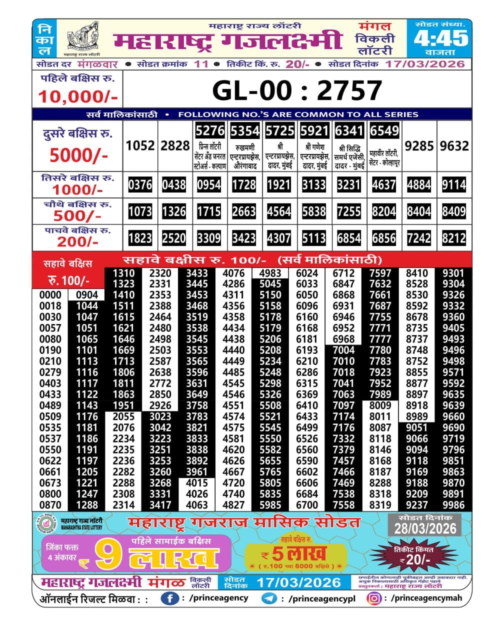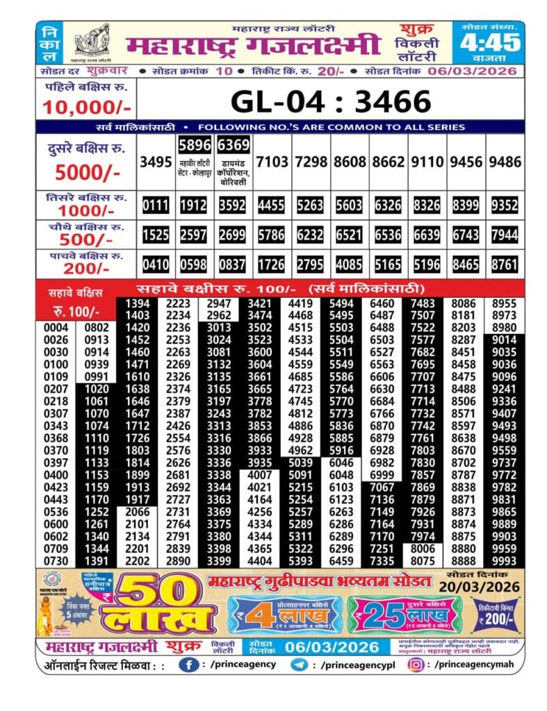 Maharashtra Gajlaxmi Shukra Weekly Draw 06.03.2026 Result 4.45 PM 0 Likes 55 Views Related Articles 0 70Maharashtra Gajlaxmi Mangal Weekly Draw 17.03.2026 Result 4.45 PM 0 111Maharashtra Akshay Weekly Draw Result 19.11.2025 0 45Sikkim State Labhlaxmi Delight Wednesday Weekly Lottery 18.03.2026 Result 4 PM 0 54Dear 1000 Quarterly Lottery 10.1.2026 At 7 PM