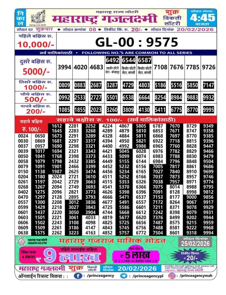 Maharashtra Gajlaxmi Shukra Weekly Draw 20.02.2026 Result 4.45 PM 0 Likes 15 Views Related Articles 0 49Maharashtra Vaibhavlaxmi Weekly Draw 23.01.2026 Result 4.30pm 0 21Sikkim State Labhlaxmi Bliss Monday Weekly Lottery 16.2.2026 Result 4 PM 2 90Maharashtra Ganeshlaxmi Samruddhi Weekly Draw 03.01.2026 Result 5pm 0 66Golden 100 Gold Monthly Lottery 07.01.2026 Result 6.30 PM