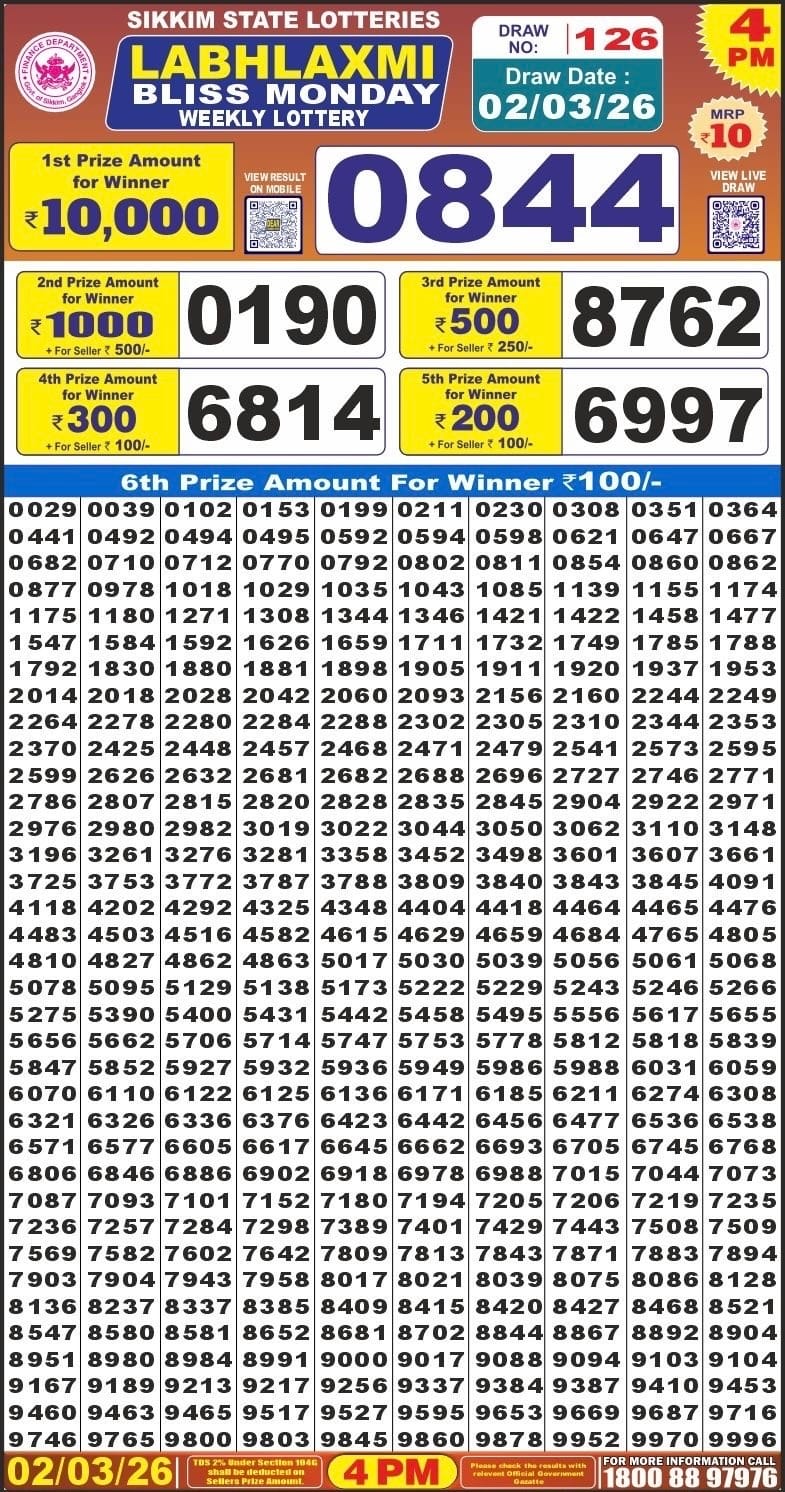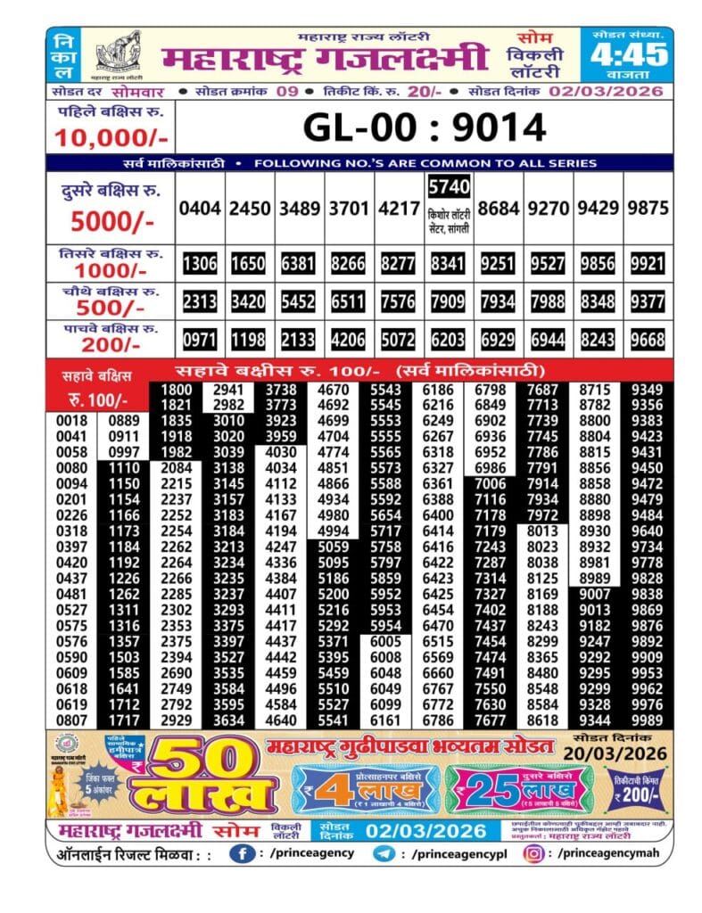 Maharashtra Gajlaxmi Som Weekly Draw 02.03.2026 Result 4.45 PM 0 Likes 62 Views Related Articles 1 198Goa state rajshree 50 monthly lottery 26.2.2026 at 6.30pm 0 265Maharashtra Akarshak Pushkaraj Weekly Draw Result 13.11.2025 0 89Maharashtra Ganeshlaxmi Bhagyashali Weekly Draw 17.11.2025 Result 5pm 0 36Labhlaxmi Bliss Monday Weekly Lottery 02.03.2026 Result 4 PM