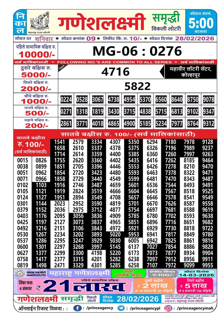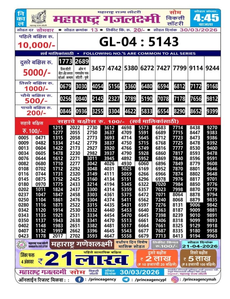 Maharashtra Gajlaxmi Som Weekly Draw 30.03.2026 Result 4.45 PM 0 Likes 35 Views Related Articles 0 46Rajshree Lily Weekly Lottery 18.2.2026 Result 4 PM 0 64Maharashtra Ganeshlaxmi Samruddhi Weekly Draw 28.02.2026 Result 5 PM 0 100Rajshree Lottery 8PM Daily Result 22 July 2025 0 103Golden 100 Gold Monthly Lottery 01.04.2026 Result 6.45 PM