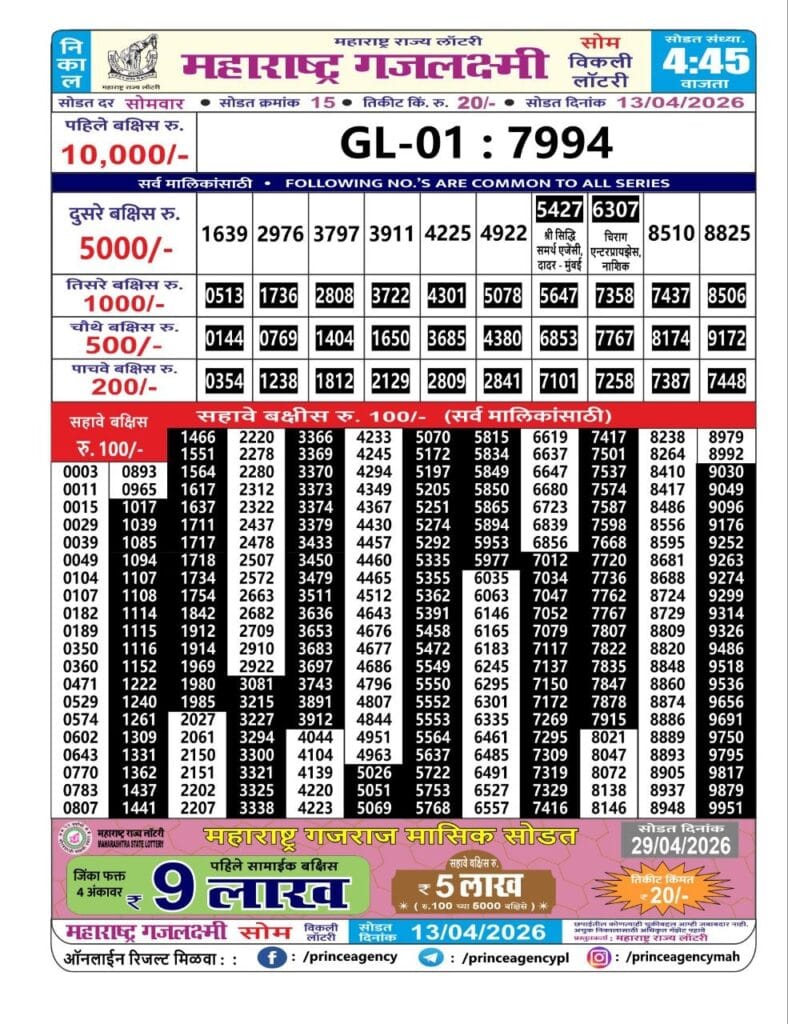 Maharashtra Gajlaxmi Som Weekly Lottery 13.04.2026 Result 4.45 PM 0 Likes 7 Views Related Articles 0 63Rajshree Jasmine Weekly Lottery 20.2.2026 Result 4 PM 0 36Rajshree 50 Ravi Weekly Lottery 29.03.2026 Result 7.30 PM 0 56Sikkim State Labhlaxmi Power Sunday Weekly Lottery 15.03.2026 Result 4 PM 0 28Maharashtra Vaibhavlaxmi Weekly Draw Result 10.04.2026