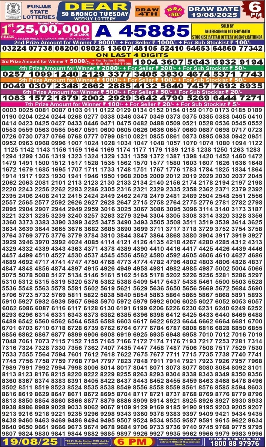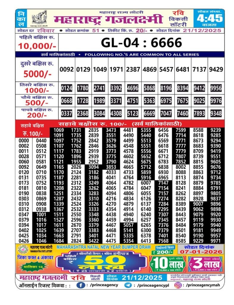 Maharashtra Gajlaxmi Weekly Lottery Draw 21.12.2025 Result 4.30pm 0 Likes 16 Views Related Articles 0 50Punjab State Dear 50 Beast Monday 6pm Lottery Result 10.11.2025 0 41Maharashtra Ganeshlaxmi Dhan Weekly Draw 19.12.2025 Result 5pm 0 79Rajshree 250 monthly lottery 1 July 2025 At 6:30 PM (Rathyatra Special) 0 79Punjab State Dear 50 Bronco Tuesday 6pm Lottery Result 19.08.2025