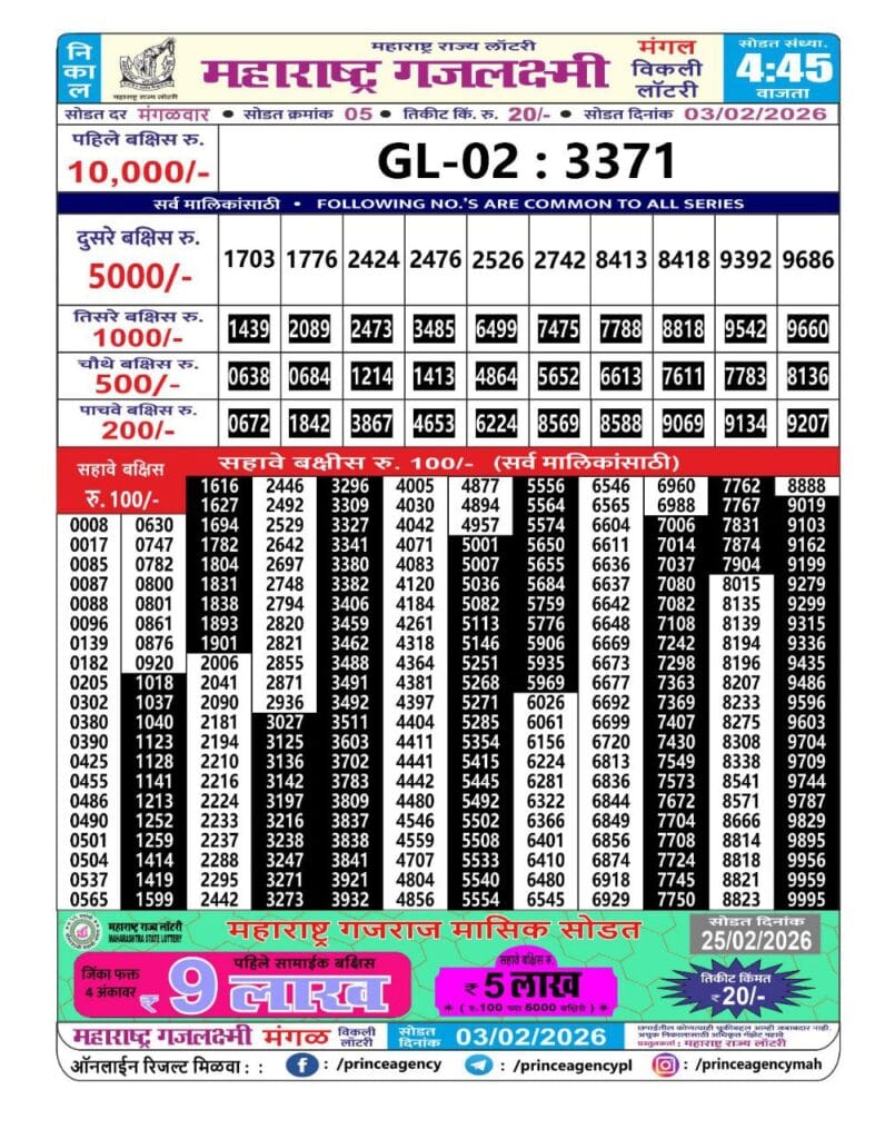 Maharashtra Gajlaxmi Weekly Lottery Draw 3.2.2026 Result 4.45pm 0 Likes 135 Views Related Articles 0 46Rajshree 10 Evening Shukra Weekly Lottery 27.03.2026 Result 5.40 PM 0 100Rajshree 30 Lottery 8:30PM Result 20.07.2025 0 81Rajshree 50 Shukra Weekly Lottery 20.2.2026 Result 7.30 PM 0 46Rajshree Night Shani Weekly Lottery 21.03.2026 Result 9 PM