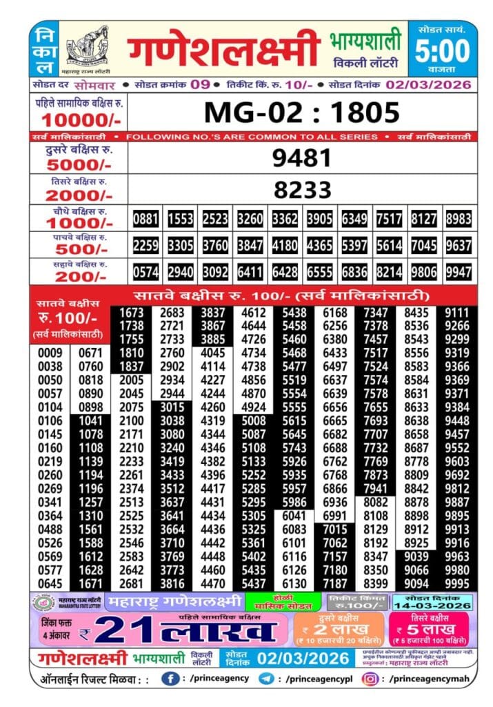 Maharashtra Ganeshlaxmi Bhagyashali Weekly Draw 02.03.2026 Result 5 PM 0 Likes 44 Views Related Articles 0 102पंजाब स्टेट डिअर 200 मंथली लाटरी 7.2.2026 0 31Maharashtra Sahyadri Deeplaxmi Weekly Draw 02.04.2026 Result 4.30 PM 0 39Maharashtra Sahyadri Vijayalaxmi Weekly Draw 25.03.2026 Result 4.30 PM 0 51Rajshree 50 Mangal Saturday Weekly Lottery 24.2.2026 Result 7.30 PM
