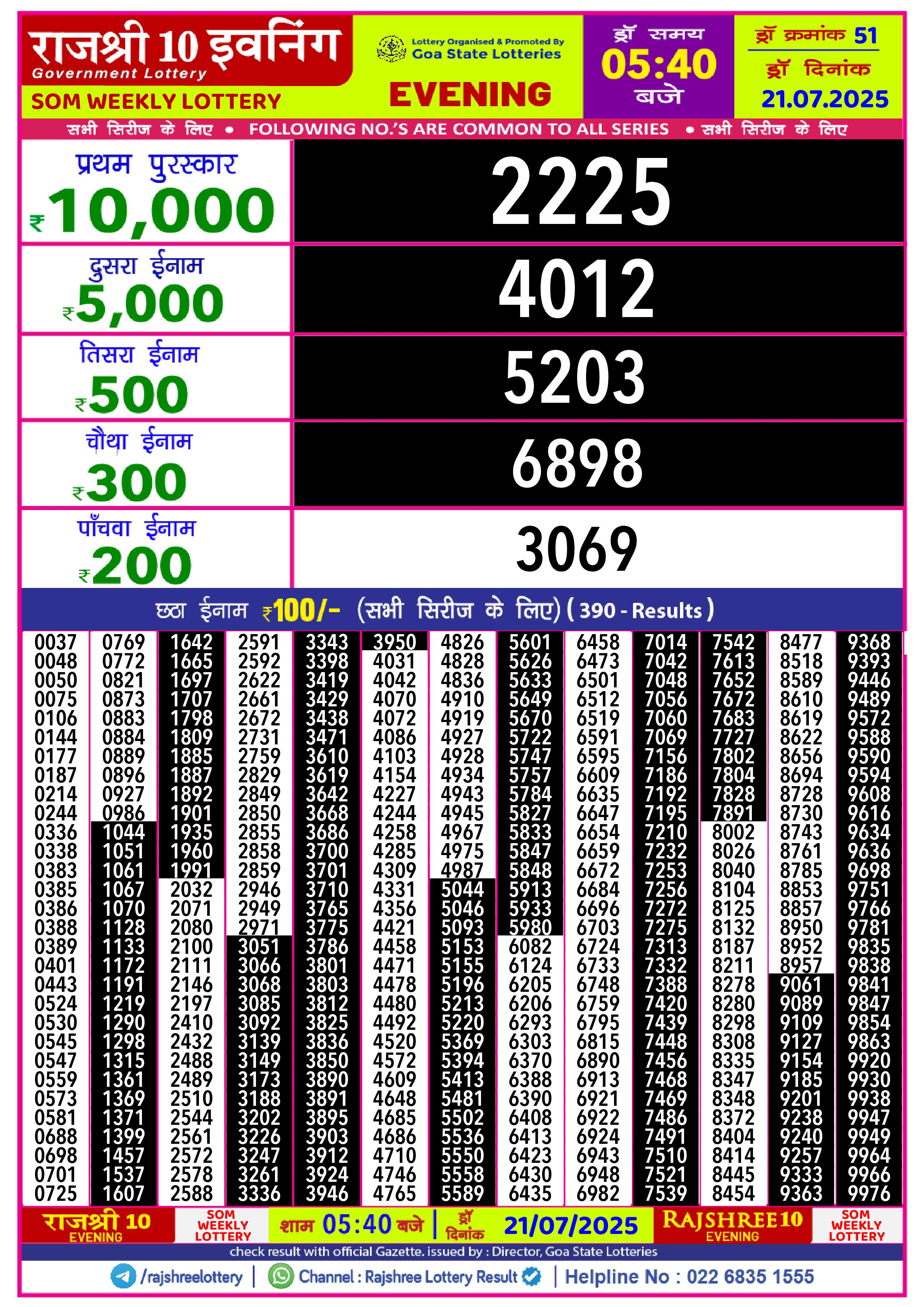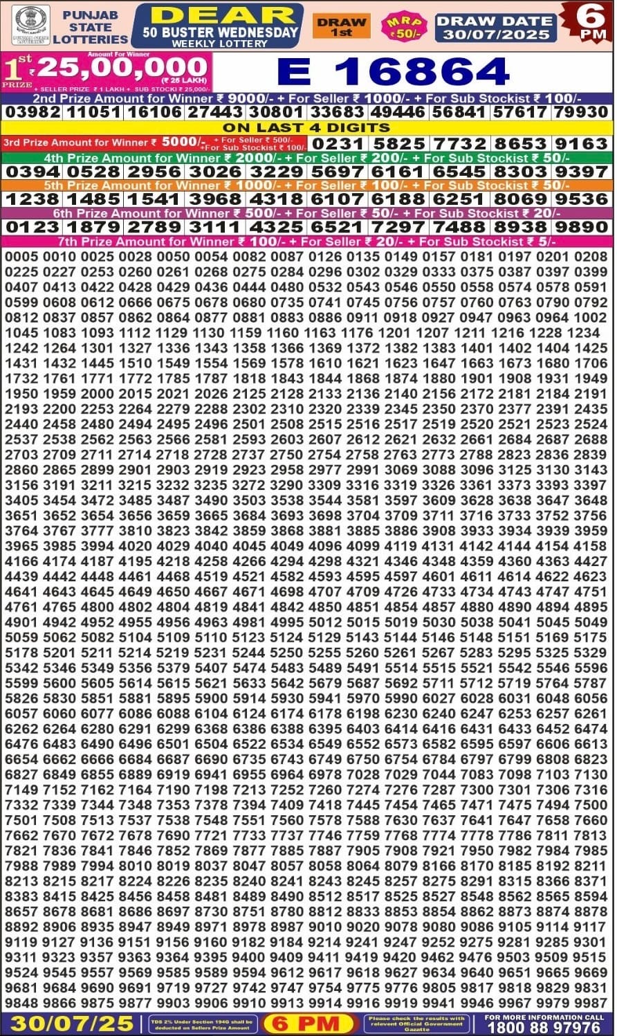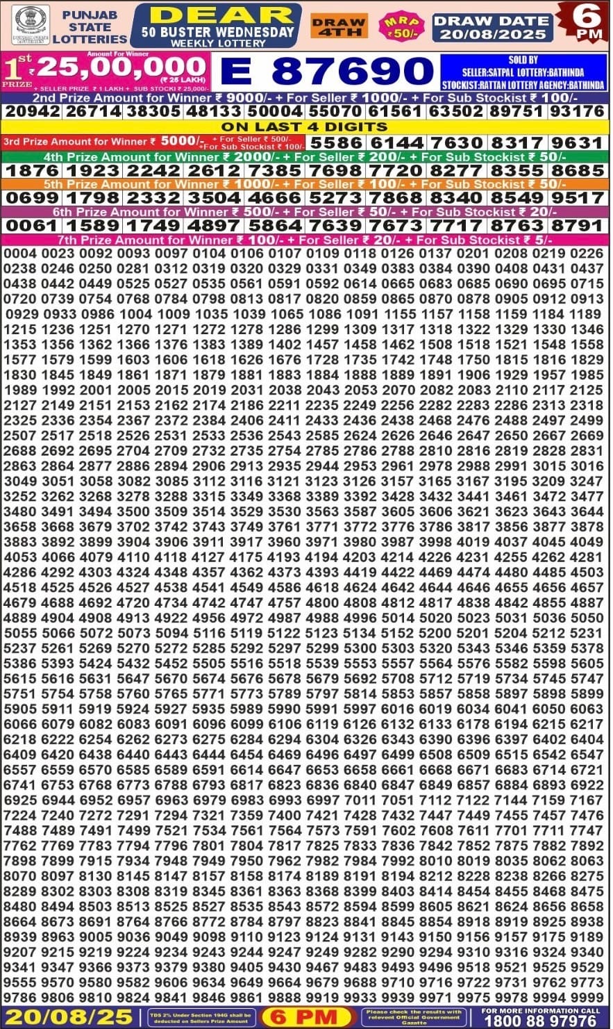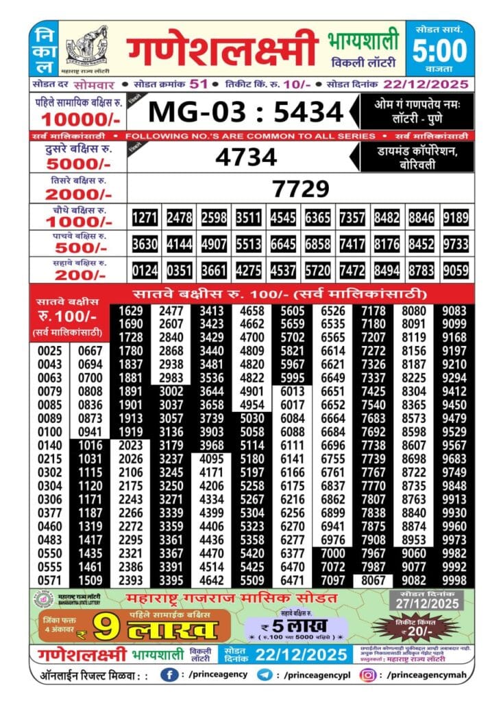 Maharashtra Ganeshlaxmi Bhagyashali Weekly Draw 22.12.2025 Result 5pm 0 Likes 22 Views Related Articles 0 15Maharashtra Gajlaxmi Weekly Lottery Draw 21.12.2025 Result 4.30pm 0 21Punjab state dear 20 monthly lottery 23 december 2025 at 7pm 0 77Punjab State Dear 50 Buster Wednesday 6pm Lottery Result 20.08.2025 0 86Punjab state dear 50 Buster Wednesday Lottery 30.07.2025 Result 6PM