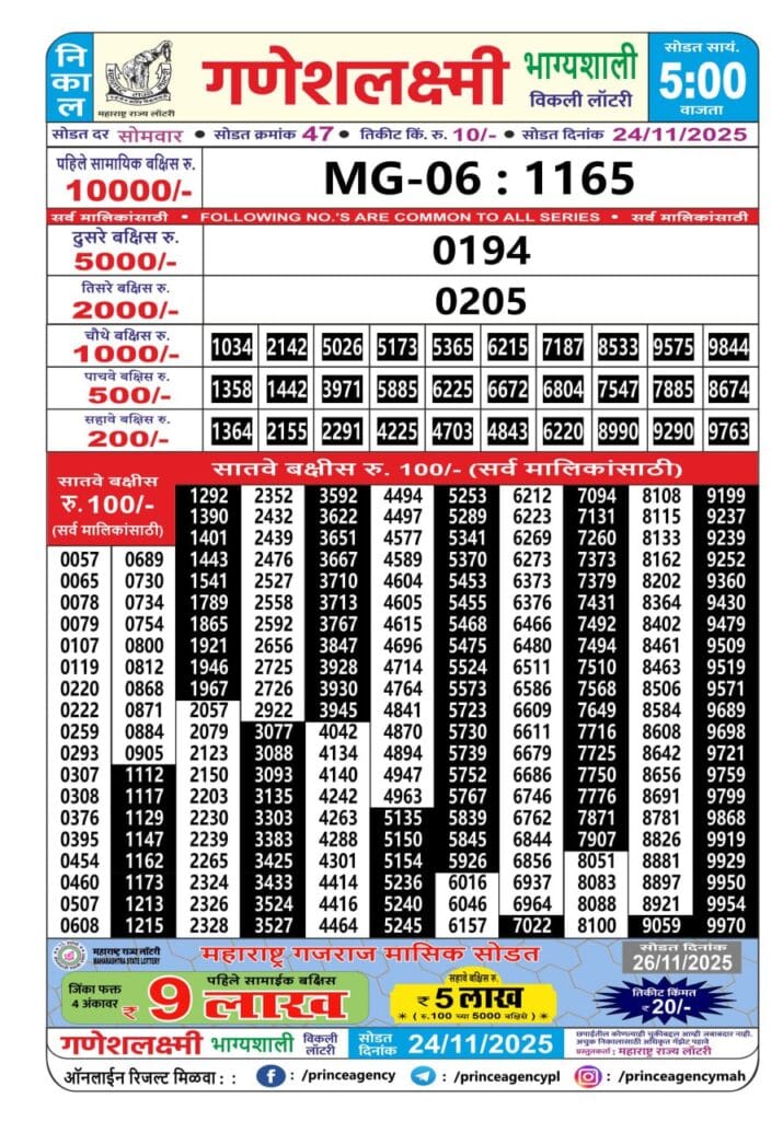 Maharashtra Ganeshlaxmi Bhagyashali Weekly Draw 24.11.2025 Result 5pm 0 Likes 111 Views Related Articles 0 94Maharashtra Gajlaxmi Mangal Weekly Draw 09.12.2025 Result 4.45pm 0 74Maharashtra Sahyadri Prabhalaxmi Weekly Draw 10.01.2026 Result 4.30 PM 0 73Rajshree 100 Monthly Lottery 04.12.2025 Result 6.30pm 0 117Maharashtra Ganeshlaxmi Vijayee Weekly Draw Result 29.10.2025