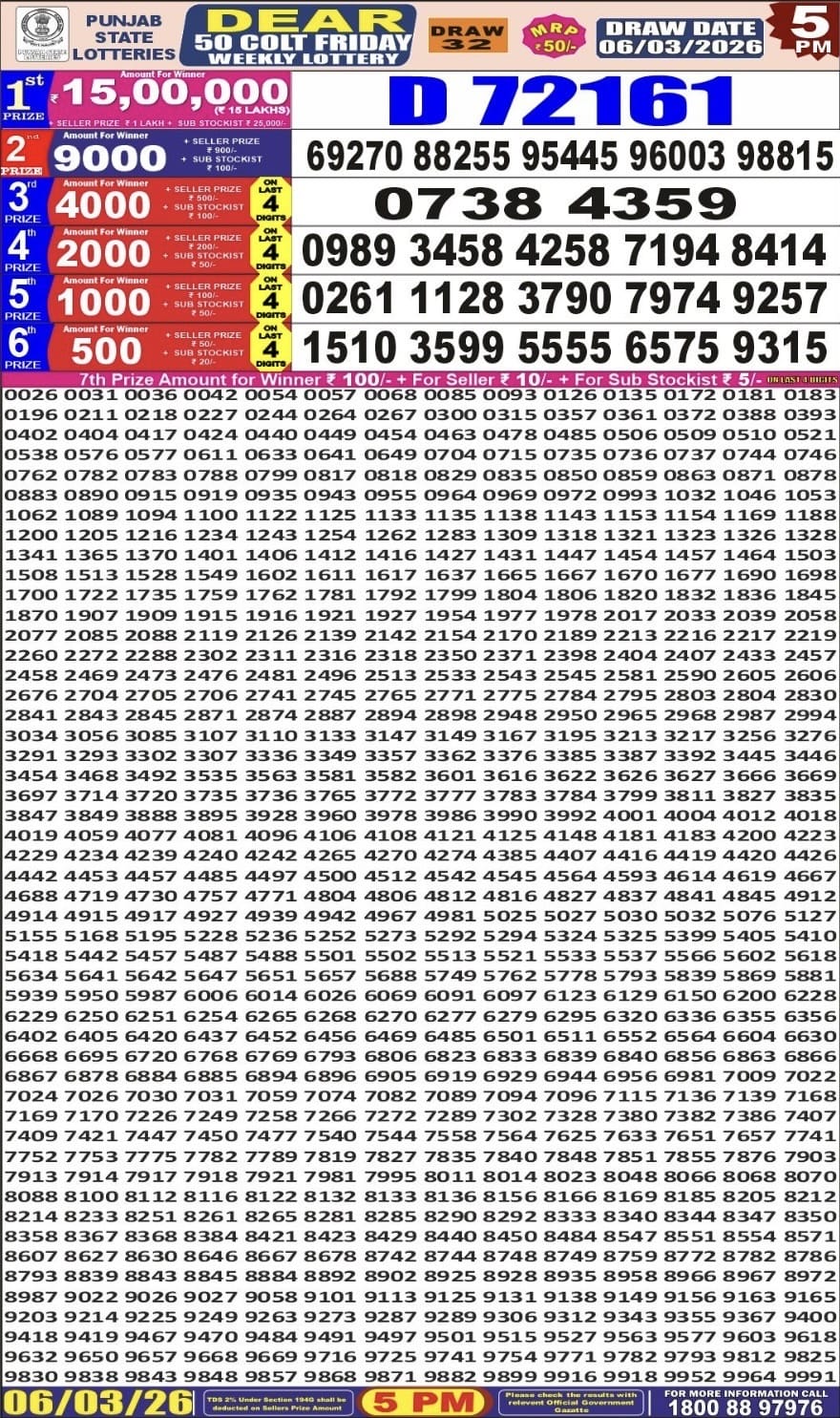 Maharashtra Ganeshlaxmi Bhagyashali Weekly Draw 30.03.2026 Result 5 PM 0 Likes 24 Views Related Articles 0 28Rajshree Monday Weekly Lottery 23.03.2026 Result 8 PM 61 494Punjab state dear 200 monthly lottery 3 january 2026 at 6pm 0 44Punjab State Dear 50 Colt Friday Weekly Lottery 06.03.2026 Result 5 PM 0 114Goa state rajshree 50 monthlylottery 22.1.2026 at 6.30pm