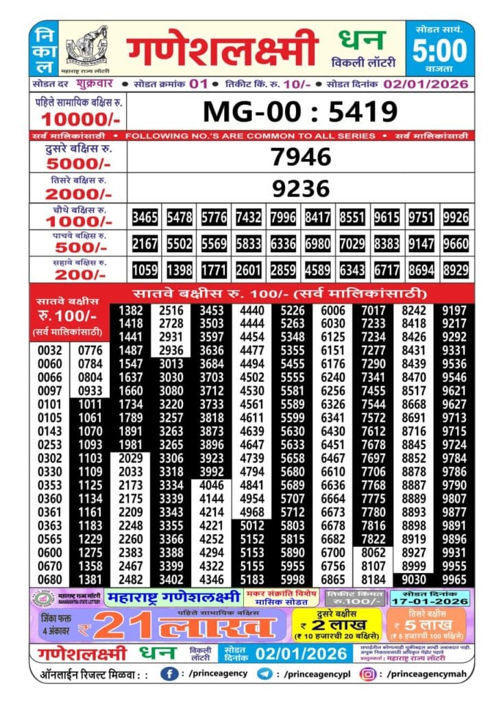 Maharashtra Ganeshlaxmi Dhan Weekly Draw 02.01.2025 Result 5 PM 0 Likes 68 Views Related Articles 1 110Punjab State Dear 50 Jackal Saturday 6pm Lottery Result 13.12.2025 0 38Dear 1000 Quarterly Lottery 10.1.2026 At 7 PM 0 27Rajshree Monday Weekly Lottery 16.02.2026 Result 8 PM 0 117Maharashtra Sahyadri Mahalaxmi Weekly Draw 28.10.2025 Result 4.30pm