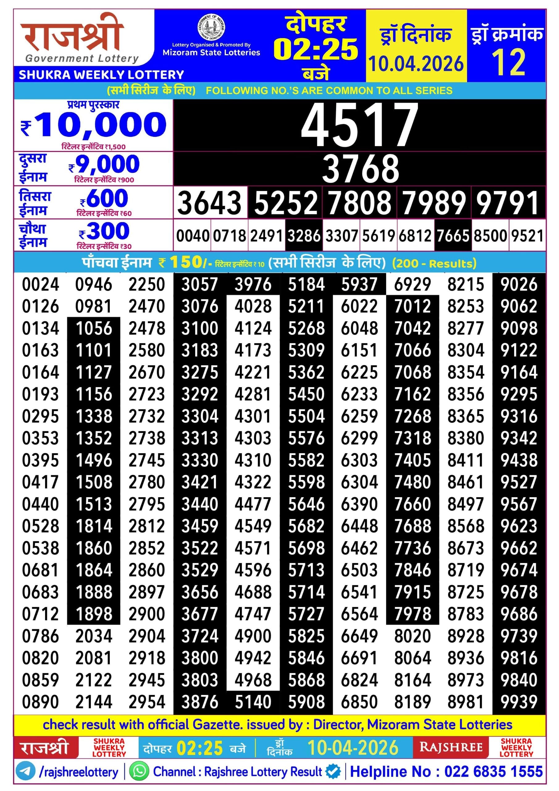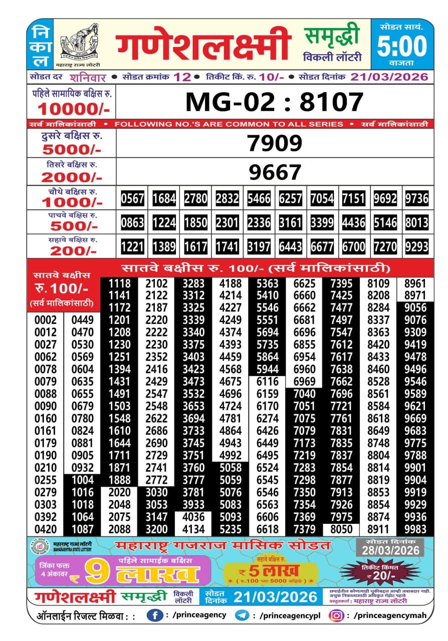Maharashtra Ganeshlaxmi Dhan Weekly Draw 10.04.2026 Result 5 PM 0 Likes 6 Views Related Articles 2 413Goa State Rajshree 200 Monthly Lottery (Gudipadwa Special) 19.3.2026 Result 7 PM 0 97Maharashtra Ganeshlaxmi Bhagyashali Weekly Draw 21.07.2025 Result 5pm 11 331Rajshree 250 Monthly Lottery 3 March 2026 At 6.30 PM (Holi Special) 0 7Rajshree Shukra Weekly Lottery 10.04.2026 Result 2.25 PM