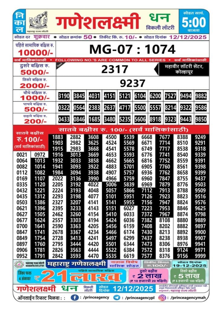 Maharashtra Ganeshlaxmi Dhan Weekly Draw 12.12.2025 Result 5pm 0 Likes 50 Views Related Articles 0 94Maharashtra Sahyadri Deeplaxmi Weekly Draw 30.10.2025 Result 4.30pm 0 30Golden 200 Gold Monthly Lottery Result 17.12.2025 At 6.30pm 0 53Maharashtra Ganeshlaxmi Shubh Weekly Draw 25.11.2025 Result 5pm 0 65Dear Puja Bumper Lottery 11.10.2025 Result 8PM