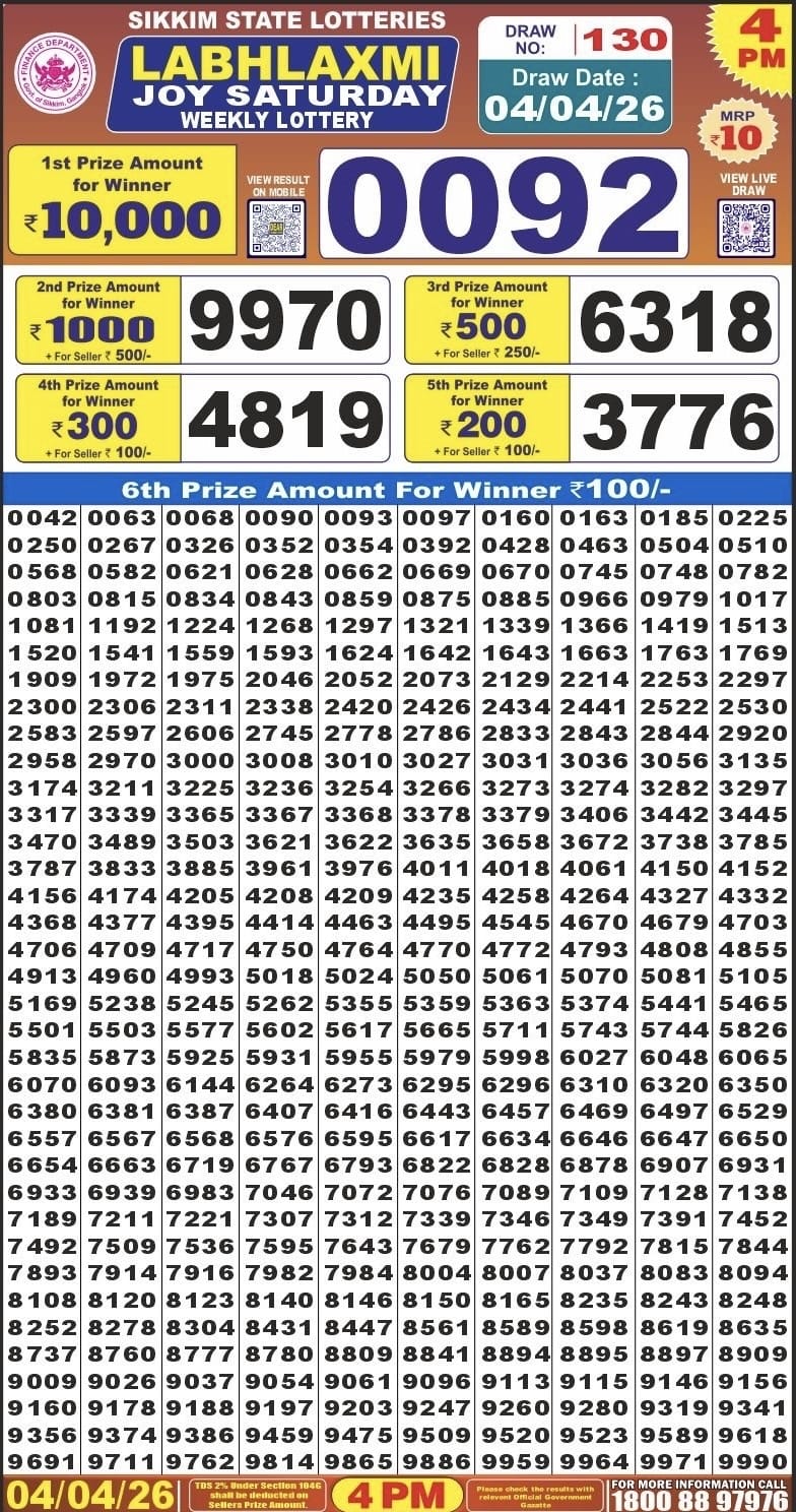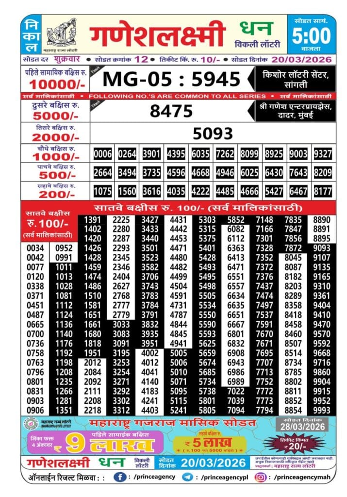 Maharashtra Ganeshlaxmi Dhan Weekly Draw 20.03.2026 Result 5 PM 0 Likes 59 Views Related Articles 0 140Maharashtra Laxmi Weekly Draw Result 25.10.2025 0 12Sikkim State Labhlaxmi Joy Saturday Weekly Lottery 04.04.2026 Result 4 PM 1 204Maharashtra Akshay Weekly Draw Result 18.02.2026 0 106Mh. Sahyadri Deeplaxmi Weekly Draw 24.07.2025 Result 4.30pm