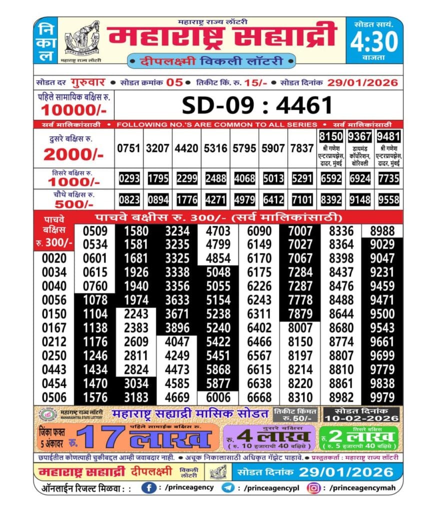 Maharashtra Ganeshlaxmi Dhan Weekly Draw 30.01.2026 Result 5pm 0 Likes 34 Views Related Articles 0 107Punjab state dear 20 monthly lottery 22.07.2025 result 6pm 0 65Maharashtra Padmini Weekly Draw Result 13.01.2026 0 81Dear 50 jhelum monday Lottery 5pm Result 21.07.2025 0 72Goa state rajshree 250 monthly lottery 7.10.2025 at 6.30pm