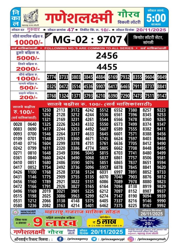 Maharashtra Ganeshlaxmi Gaurav Draw 20.11.2025 Result 5pm