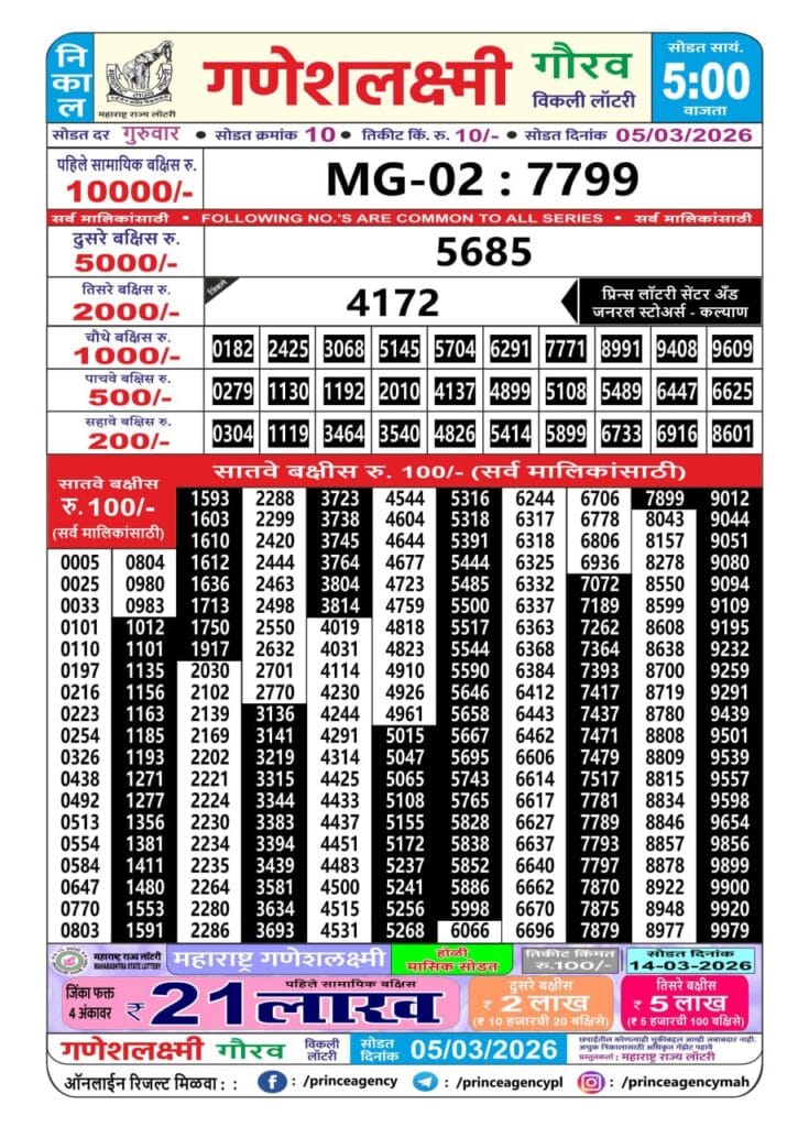 Maharashtra Ganeshlaxmi Gaurav Weekly Draw 05.03.2026 Result 5 PM 0 Likes 58 Views Related Articles 0 122Goa State Rajshree 80 Monthly Lottery 12 Febraury 2026 At 6.30 PM 0 114Maharashtra Sahyadri Rajlaxmi Weekly Draw 14.11.2025 Result 4.30pm 0 153Maharashtra Gajlaxmi Ravi Weekly Draw 23.11.2025 Result 4.45pm 0 40Rajshree Night Mangal Weekly Lottery 24.03.2026 Result 9 PM