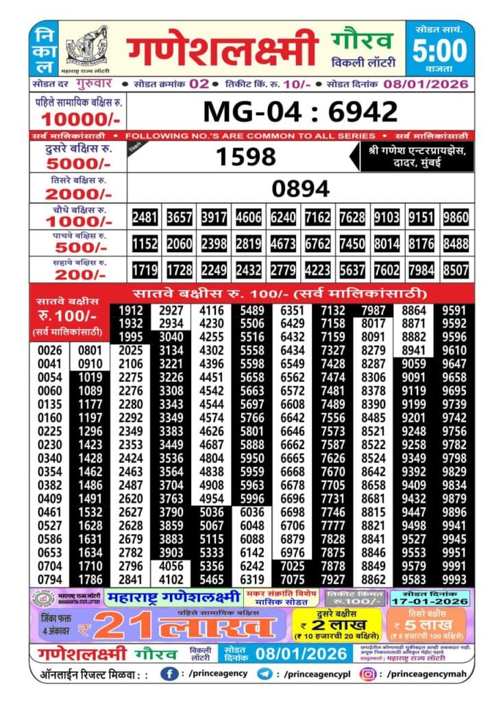 Maharashtra Ganeshlaxmi Gaurav Weekly Draw 08.01.2026 Result 5 PM