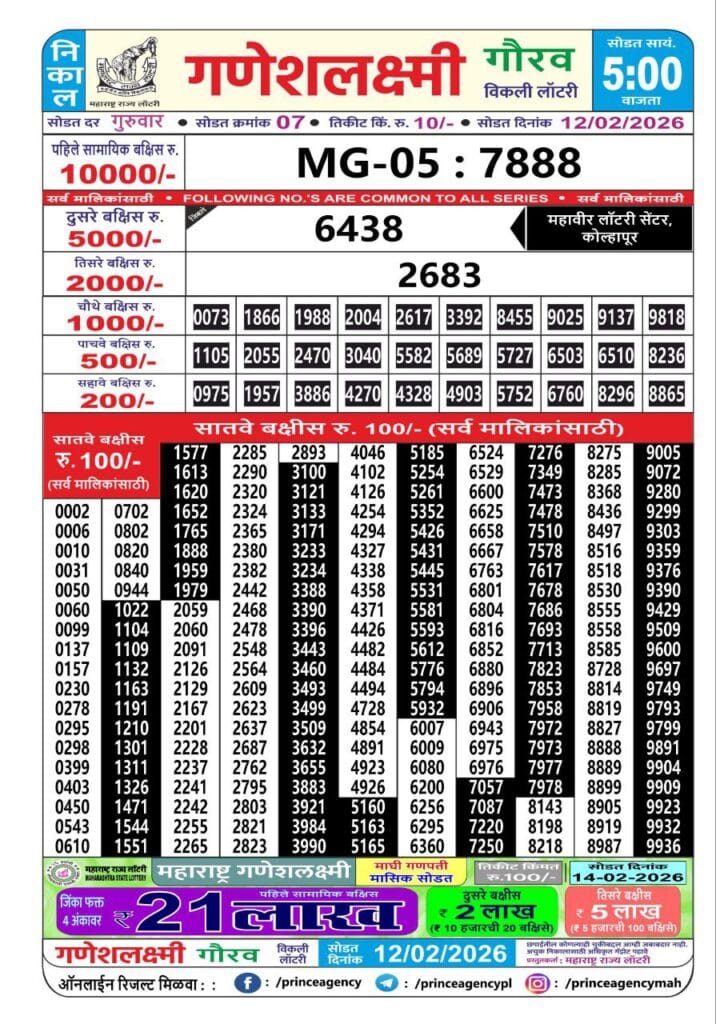 Maharashtra Ganeshlaxmi Gaurav Weekly Draw 12.2.2026 Result 5pm 1 Likes 94 Views Related Articles 0 117Maharashtra Akarshak Pushkaraj Weekly Draw Result 08.01.2026 0 37Punjab State Dear 50 Ranger Sunday Weekly Lottery 05.04.2026 Result 5 PM 0 44Rajshree Lotus Weekly Lottery 26.03.2026 Result 4 PM 0 38Rajshree 10 Evening Mangal Weekly Lottery 31.03.2026 Result 5.40 PM