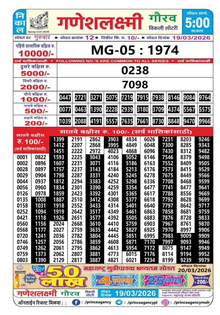 Maharashtra Ganeshlaxmi Gaurav Weekly Draw 19.03.2026 Result 5 PM 0 Likes 97 Views Related Articles 0 220Golden 200 Gold Monthly Lottery Result 19.11.2025 At 6.30PM 0 72Rajshree 50 Som Weekly Lottery 16.02.2026 Result 7.30 PM 0 71Punjab State Dear 50 6pm Lottery 23.01.2026 Result 6pm 0 144Maharashtra Sahyadri Deeplaxmi Weekly Draw 13.11.2025 Result 4.30pm