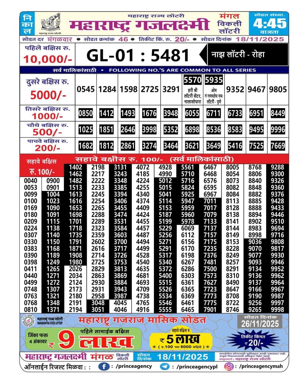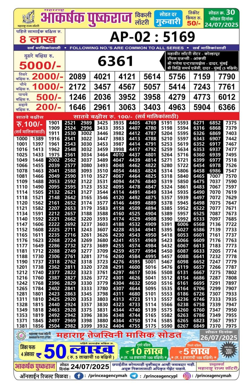 Maharashtra Ganeshlaxmi Gaurav Weekly Draw 23.10.2025 Result 5pm 0 Likes 65 Views Related Articles 0 53Maharashtra Sahyadri Rajlaxmi Weekly Draw 14.11.2025 Result 4.30pm 0 54Maharashtra Gajlaxmi Mangal Weekly Draw 18.11.2025 Result 4.45pm 0 72Maharashtra Akarshak Pushkaraj Weekly Draw Result 24.07.2025 0 84Maharashtra Sagarlaxmi Weekly Draw Result 27.10.2025