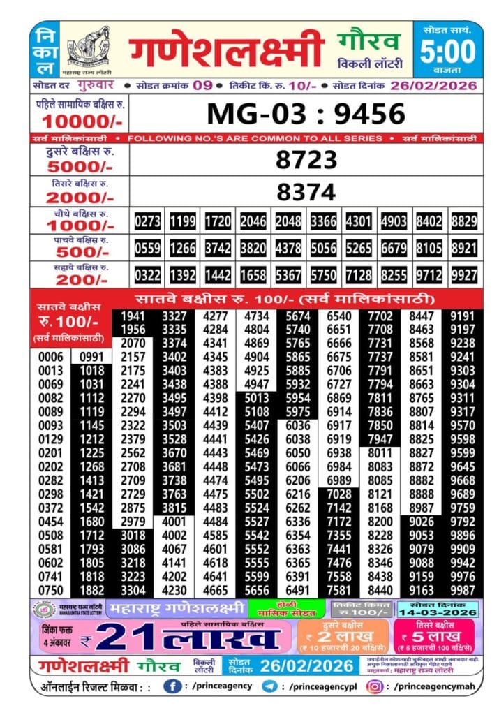 Maharashtra Ganeshlaxmi Gaurav Weekly Draw 26.02.2026 Result 5 PM 0 Likes 66 Views Related Articles 0 106Punjab State Dear 50 Ranger Sunday 6pm Lottery Result 23.11.2025 0 126Maharashtra Gajlaxmi Guru Weekly Draw 24.07.2025 Result 4.45pm 0 193Punjab state dear 100 monthly lottery 10.2.2026 at 7pm 35 131Punjab State Dear 200 Monthly Lottery 3 January 2026 At 6 PM