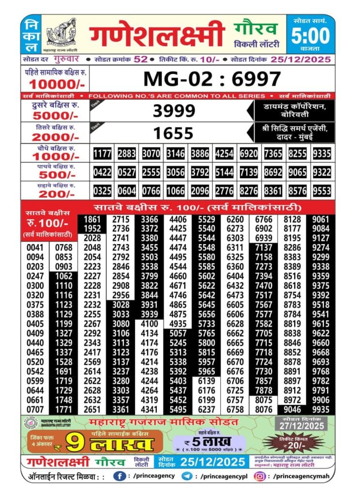 Maharashtra Ganeshlaxmi Guarav Weekly Draw 25.12.2025 Result 5pm 0 Likes 12 Views Related Articles 1 71Nagaland State Dear Rathyatra Lottery 19 July 2025 Result 8 PM 0 75Maharashtra Gajlaxmi Budh Weekly Draw Result 29.10.2025 0 107Punjab state dear 200 Monthly lottery 6.9.2025 Result 8pm 0 62Rajshree 30 Lottery 8:30PM Daily Result 22 July 2025
