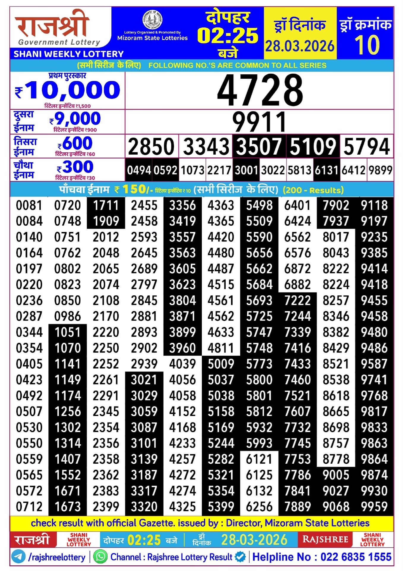 Maharashtra Ganeshlaxmi Samruddhi Weekly Draw 07.03.2026 Result 5 PM 0 Likes 49 Views Related Articles 0 64Maharashtra Ganeshlaxmi Samruddhi Weekly Draw 28.02.2026 Result 5 PM 0 71Rajshree Night Shukra Weekly Lottery 20.2.2026 Result 9 PM 0 69Maharashtra Gajlaxmi Budh Weekly Draw 25.03.2026 Result 4.45 PM 0 29Rajshree Shani Weekly Lottery 28.03.2026 Result 2.25 PM