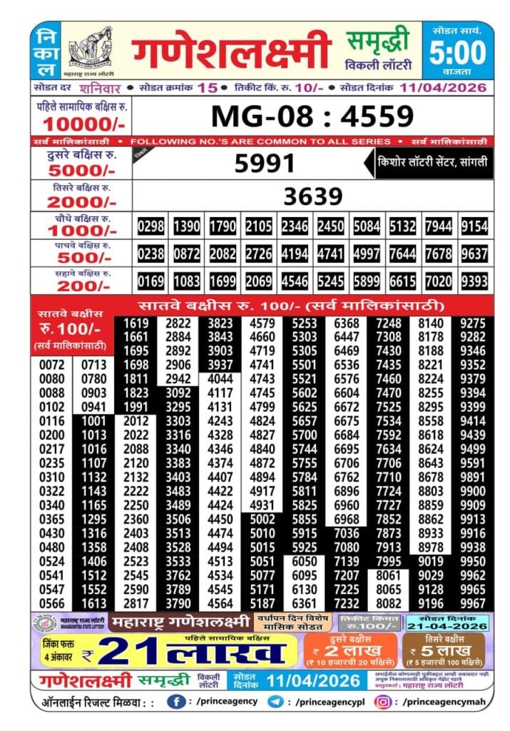 Maharashtra Ganeshlaxmi Samruddhi Weekly Draw 11.04.2026 Result 5 PM 0 Likes 3 Views Related Articles 0 139Maharashtra Natal New Year Bumper Draw Result 07.01.2026 0 112Rajshree 30 Lottery 8:30PM Result 23.07.2025 0 112Dear super diamond 7pm lottery result 22 July 2025 0 62Maharashtra Sahyadri Dhanlaxmi Weekly Draw 16.03.2026 Result 4.30 PM