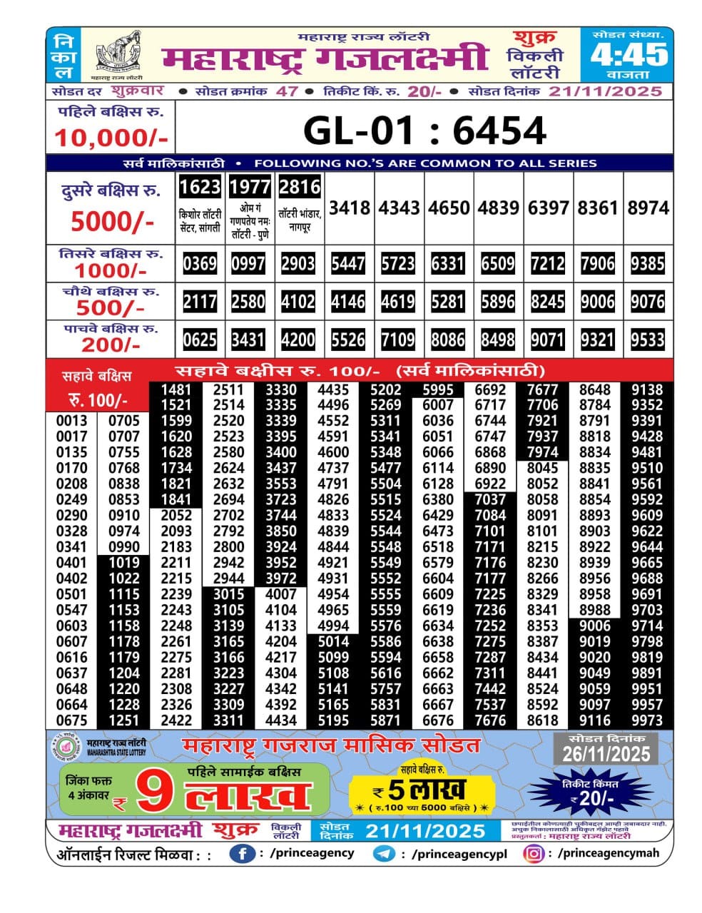 Maharashtra Ganeshlaxmi Samruddhi Weekly Draw 13.12.2025 Result 5pm 0 Likes 39 Views Related Articles 0 49Maharashtra Gajlaxmi Shukra Weekly Draw 07.11.2025 Result 4.45pm 0 76Rajshree Guru Thursday Weekly Lottery 1PM Result 24.07.2025 0 53Maharashtra Gajlaxmi Shukra Weekly Draw 21.11.2025 Result 4.45pm 0 55Maharashtra Gajlaxmi Som Weekly Draw 21.07.2025 Result 4.45pm