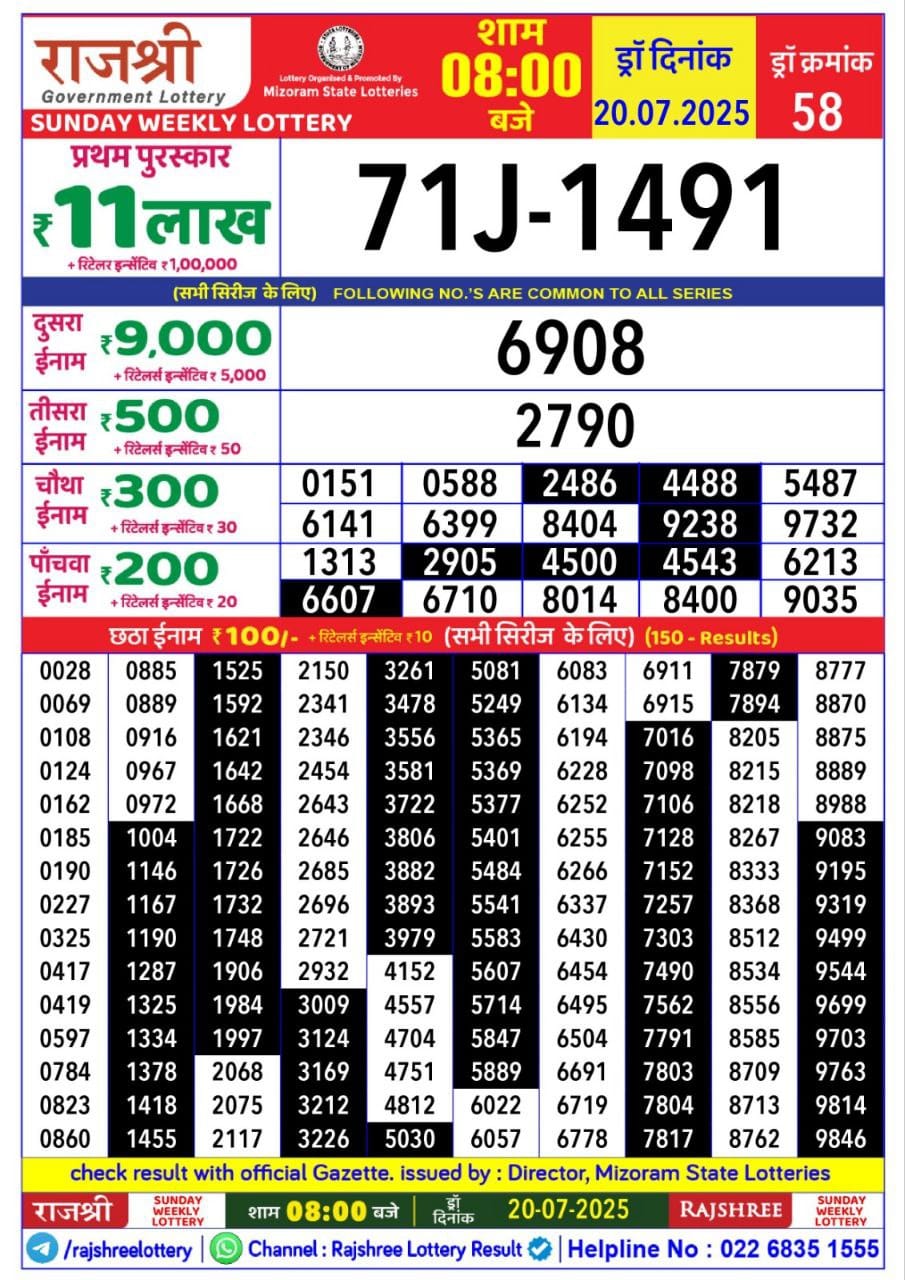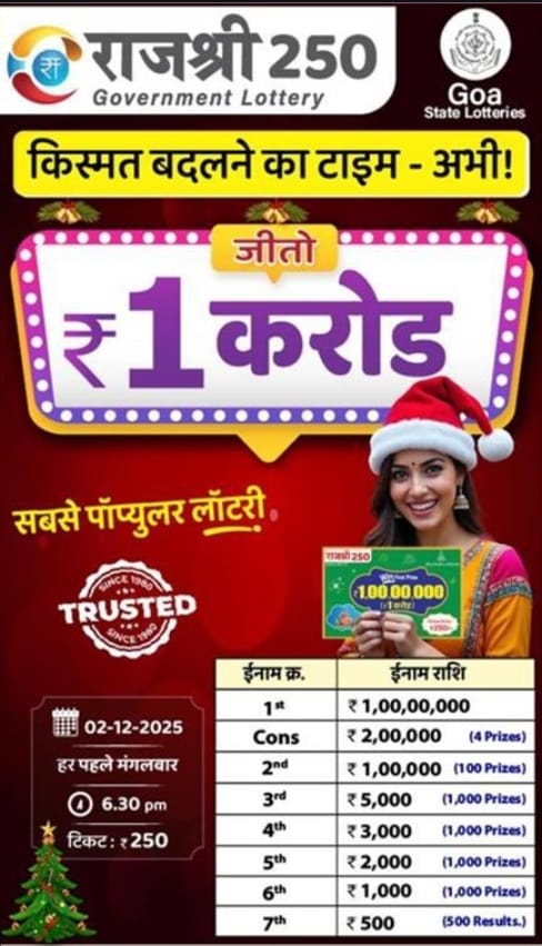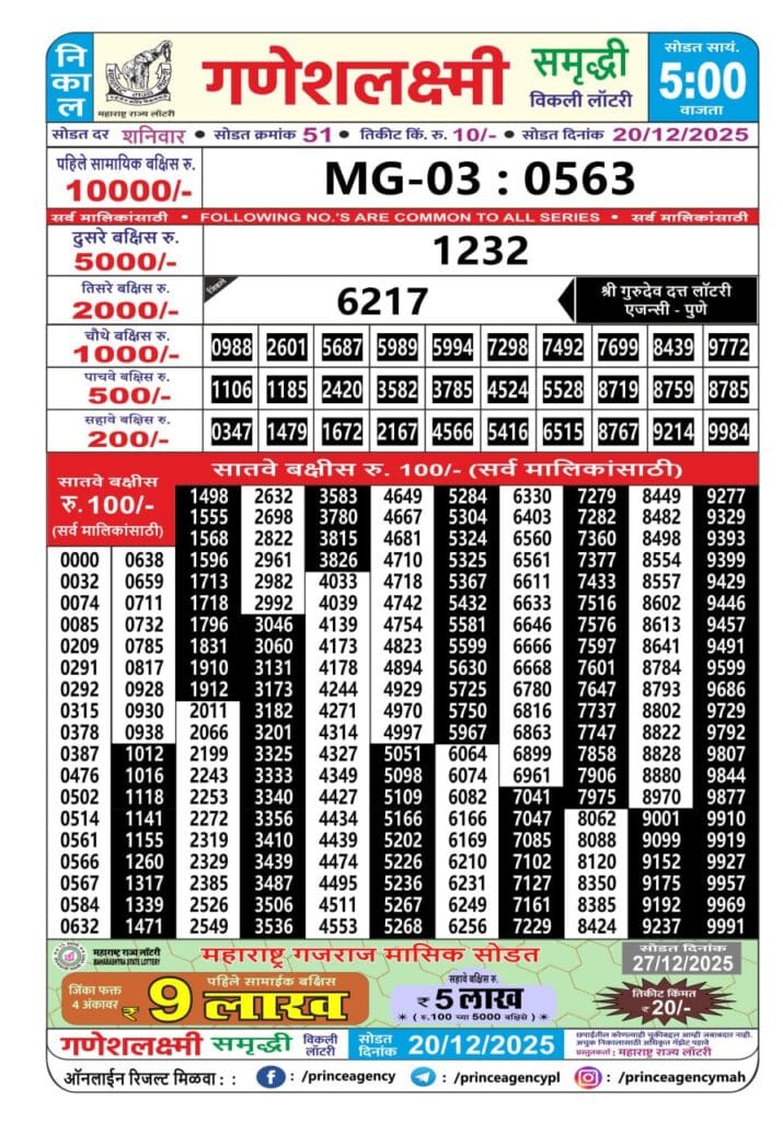 Maharashtra Ganeshlaxmi Samruddhi Weekly Draw 20.12.2025 Result 5pm 0 Likes 27 Views Related Articles 0 55Goa State Rajshree 250 Monthly Lottery 2 December 2025 At 6.30 PM 0 59Maharashtra Sahyadri Dhanlaxmi Weekly Draw 10.11.2025 Result 4.30pm 0 37Punjab State Dear 1000 Quarterly Lottery 10.1.2026 At 7 PM 0 51Punjab State Dear 50 Bronco Tuesday 6pm Lottery Result 02.12.2025
