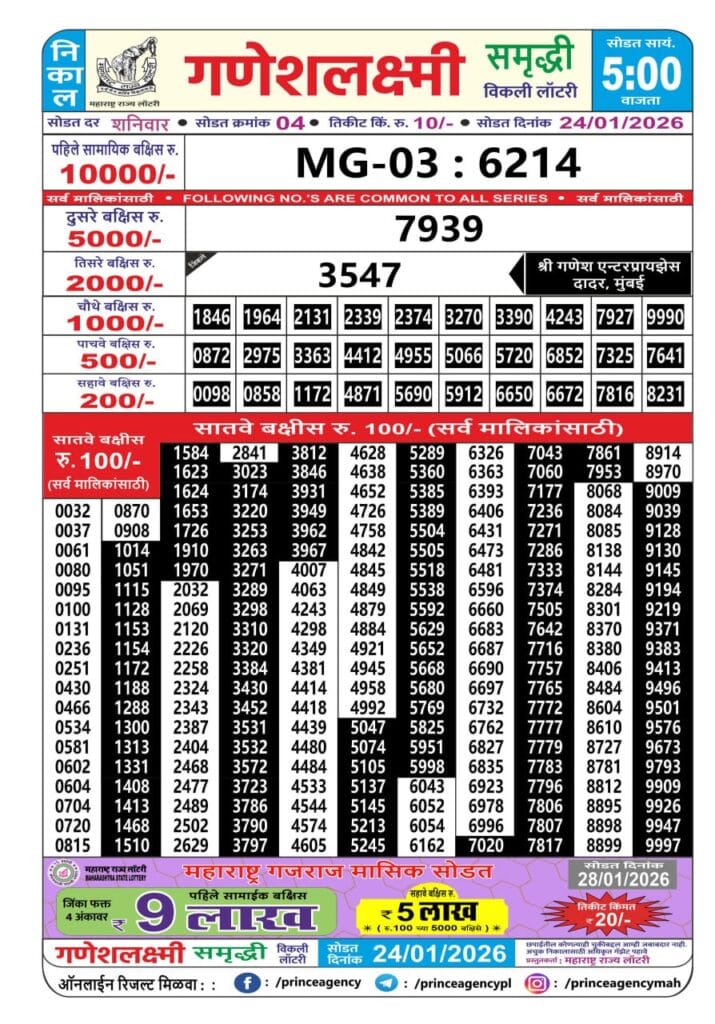 Maharashtra Ganeshlaxmi Samruddhi Weekly Draw 24.01.2026 Result 5pm 0 Likes 78 Views Related Articles 0 131Punjab state dear 50 chief thursday weekly lottery 31.07.2025 result 6pm 0 47Punjab State Dear 50 Jackal Saturday 6pm Lottery Result 10.01.2026 1 80Dear 10 Maple Monday 7pm result 21.07.2025 0 34Maharashtralaxmi Weekly Draw Result 31.01.2026