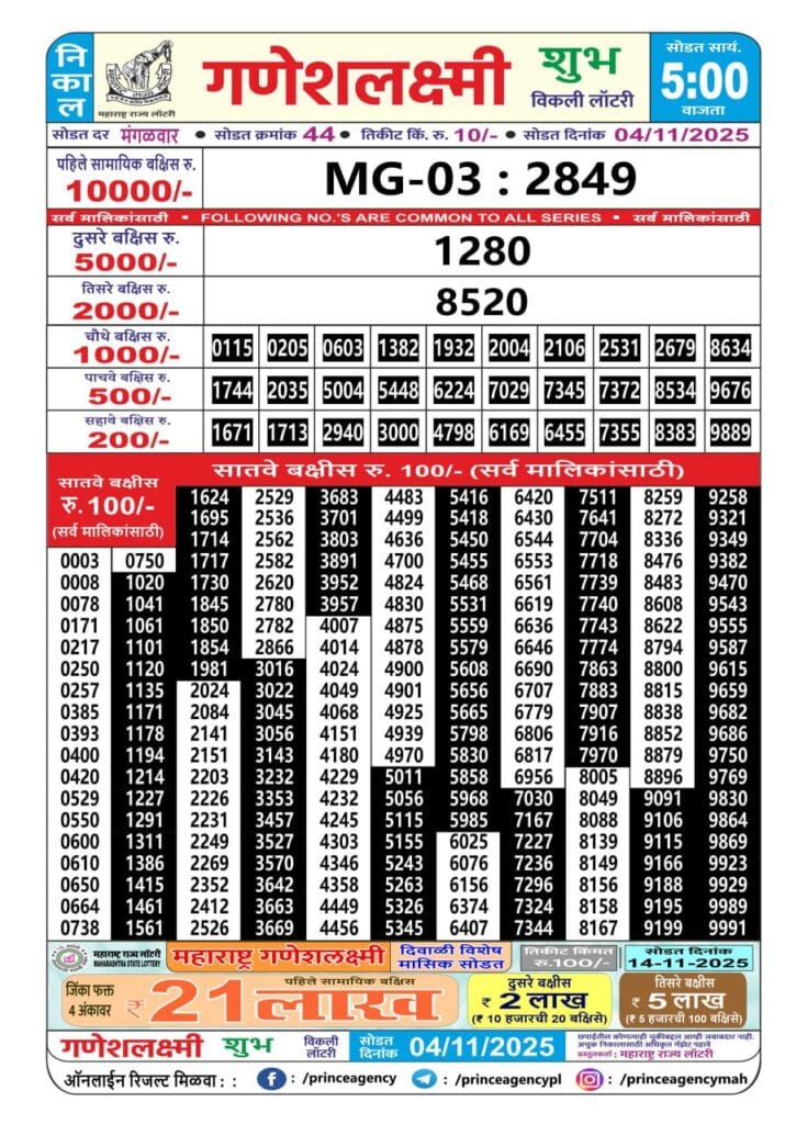 Maharashtra Ganeshlaxmi Shubh Weekly Draw 04.11.2025 Result 5pm 0 Likes 42 Views Related Articles 0 63Maharashtralaxmi Weekly Draw Result 15.11.2025 0 77Maharashtra Akshay Weekly Draw Result 22.10.2025 0 52Maharashtra Sahyadri Deeplaxmi Weekly Draw 23.10.2025 Rest 4.30pm 0 43Maharashtra Sahyadri Mahalaxmi Weekly Draw 02.12.2025 Result 4.30pm