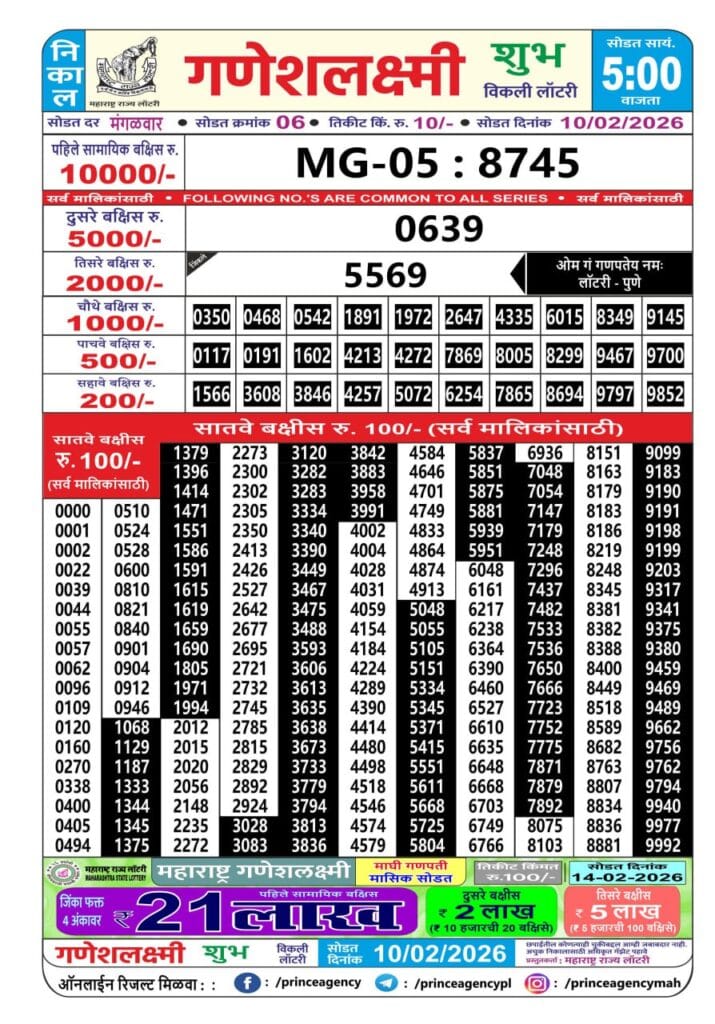 Maharashtra Ganeshlaxmi Shubh Weekly Draw 10.02.2026 Result 5 PM 0 Likes 69 Views Related Articles 0 19Rajshree Som Weekly Lottery 16.2.2026 Result 2.25 PM 2 285Punjab state dear 100 monthly lottery 9.12.2025 at 7pm 0 77Punjab State Dear 50 Chief Thursday 6pm Lottery Result 28.08.2025 0 90Maharashtra Sahyadri Vijayalaxmi Weekly Draw 21.01.2026 Result 4.30pm