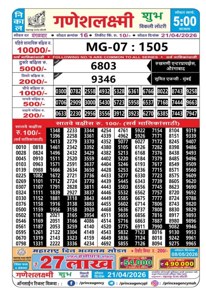 Maharashtra Ganeshlaxmi Shubh Weekly Draw 21.04.2026 Result 5 PM 0 Likes 7 Views Related Articles 0 75Sikkim State Labhlaxmi Bliss Monday Weekly Lottery 9.2.2026 Result 4 PM 0 83Golden Star Shani Weekly Lottery 24.01.2026 Result 9pm 0 46Golden Star Som Weekly Lottery 23.03.2026 Result 7 PM 0 51Rajshree Night Budh Weekly Lottery 01.04.2026 Result 9 PM
