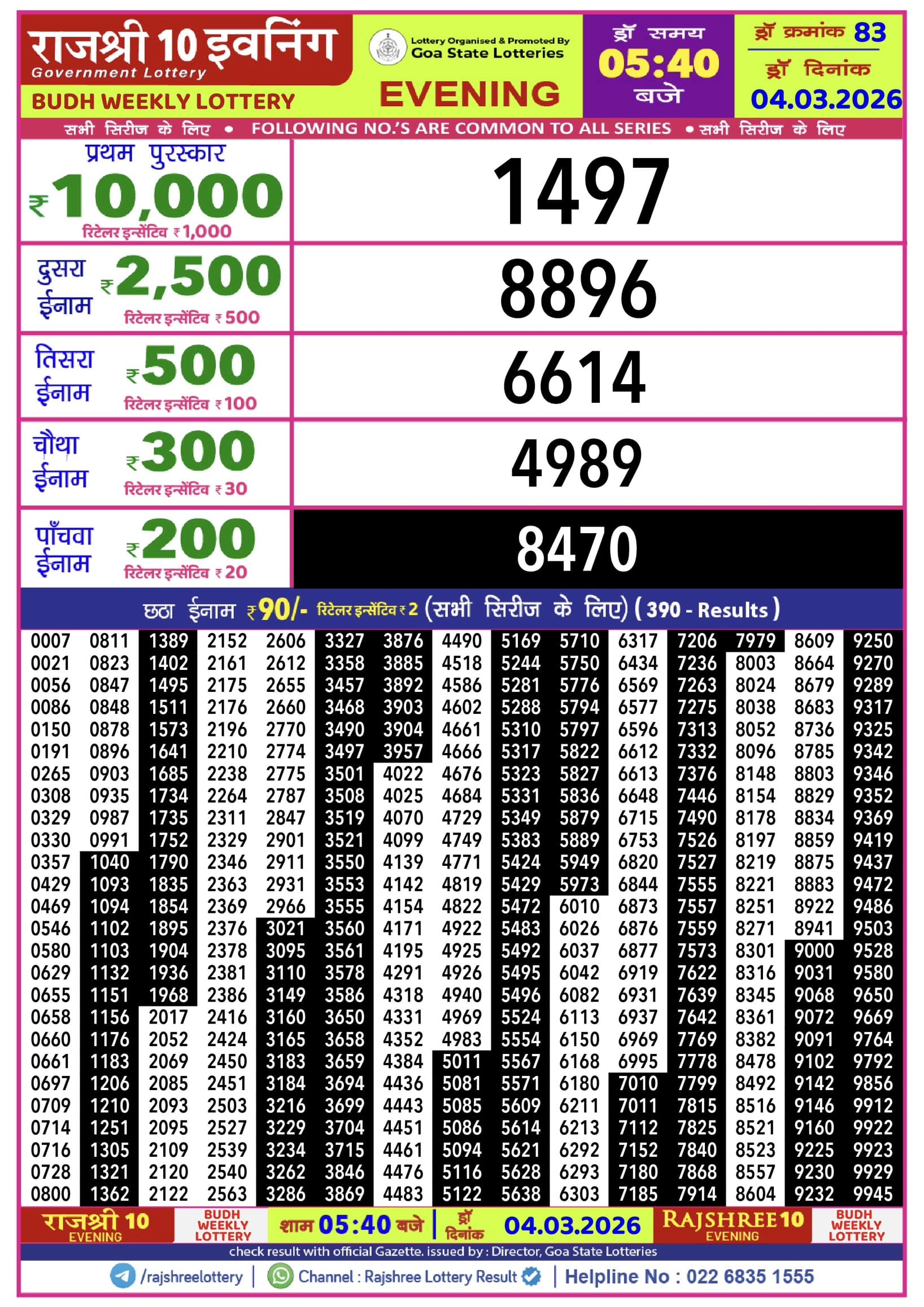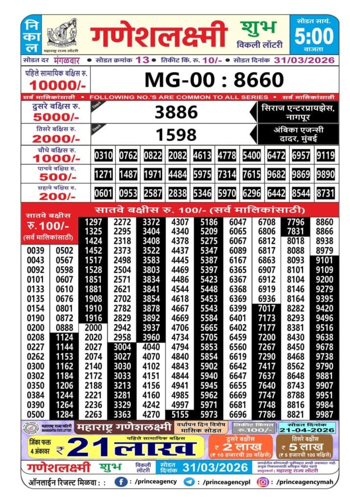 Maharashtra Ganeshlaxmi Shubh Weekly Draw 31.03.2026 Result 5 PM 0 Likes 40 Views Related Articles 0 62Maharashtra Gudhi Padva (Bumper) Draw Result 20.03.2026 0 64Punjab State Dear 50 Ranger Sunday Weekly Lottery 22.2.2026 Result 5 PM 1 179Punjab dear 100 monthly lottery 08.07.2025 result 6pm 0 96Maharashtra Gajlaxmi Budh Weekly Draw 21.01.2026 Result 4.45pm