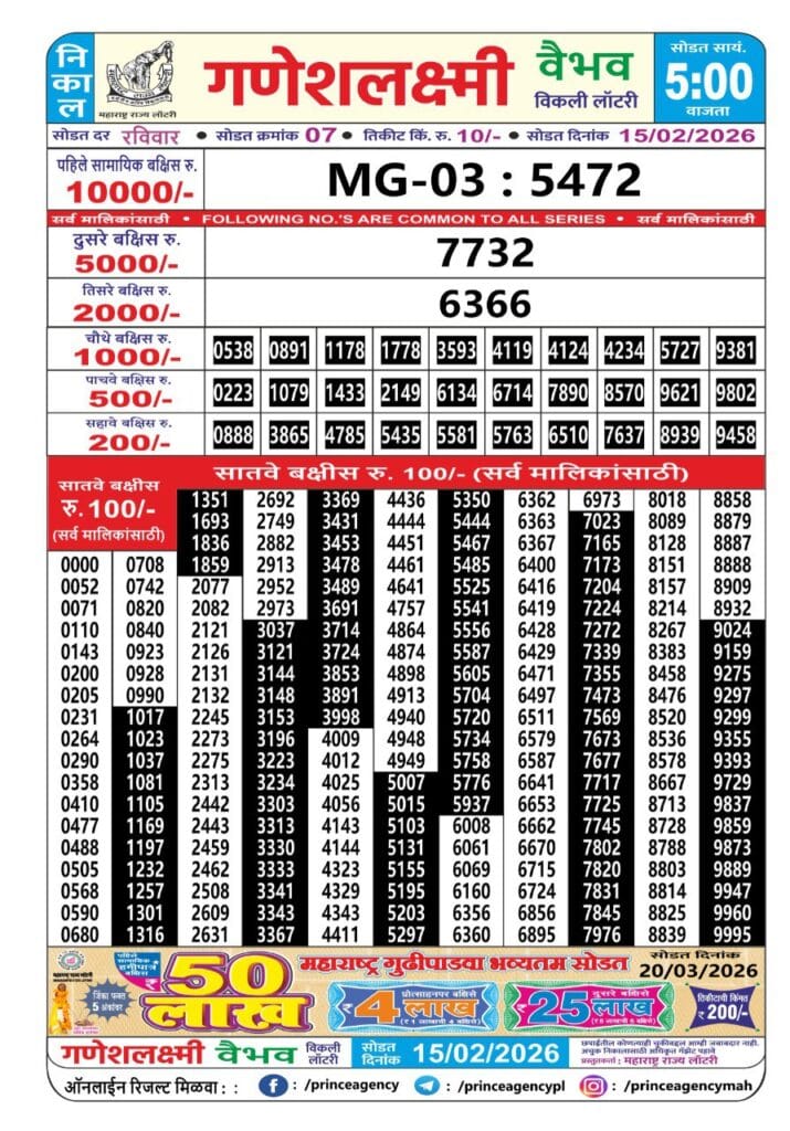 Maharashtra Ganeshlaxmi Vaibhav Weekly Draw 15.02.2026 Result 5 PM 0 Likes 52 Views Related Articles 0 47Punjab State Dear 50 Jackal Saturday 6pm Lottery Result 10.01.2026 0 50Punjab State Dear 50 Bronco Tuesday 6pm Lottery Result 20.01.2026 0 83Rajshree Christmas Special Lottery 30.12.2025 Result 6.30PM 0 151Maharashtralaxmi Weekly Draw Result 22.11.2025