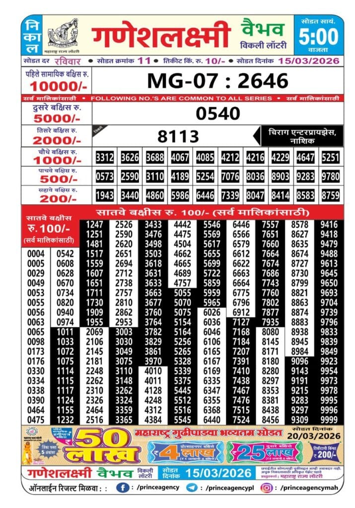 Maharashtra Ganeshlaxmi Vaibhav Weekly Draw 15.03.2026 Result 5 PM 0 Likes 47 Views Related Articles 0 161Maharashtra Sahyadri Deeplaxmi Weekly Draw 30.10.2025 Result 4.30pm 0 48Maharashtra Gajlaxmi Budh Weekly Draw 01.04.2026 Result 4.45 PM 0 94Golden Star Guru Weekly Lottery 29.01.2026 Result 9pm 0 69Sikkim State Labhlaxmi Delight Weekly Lottery 4.2.2026 Result 4 PM