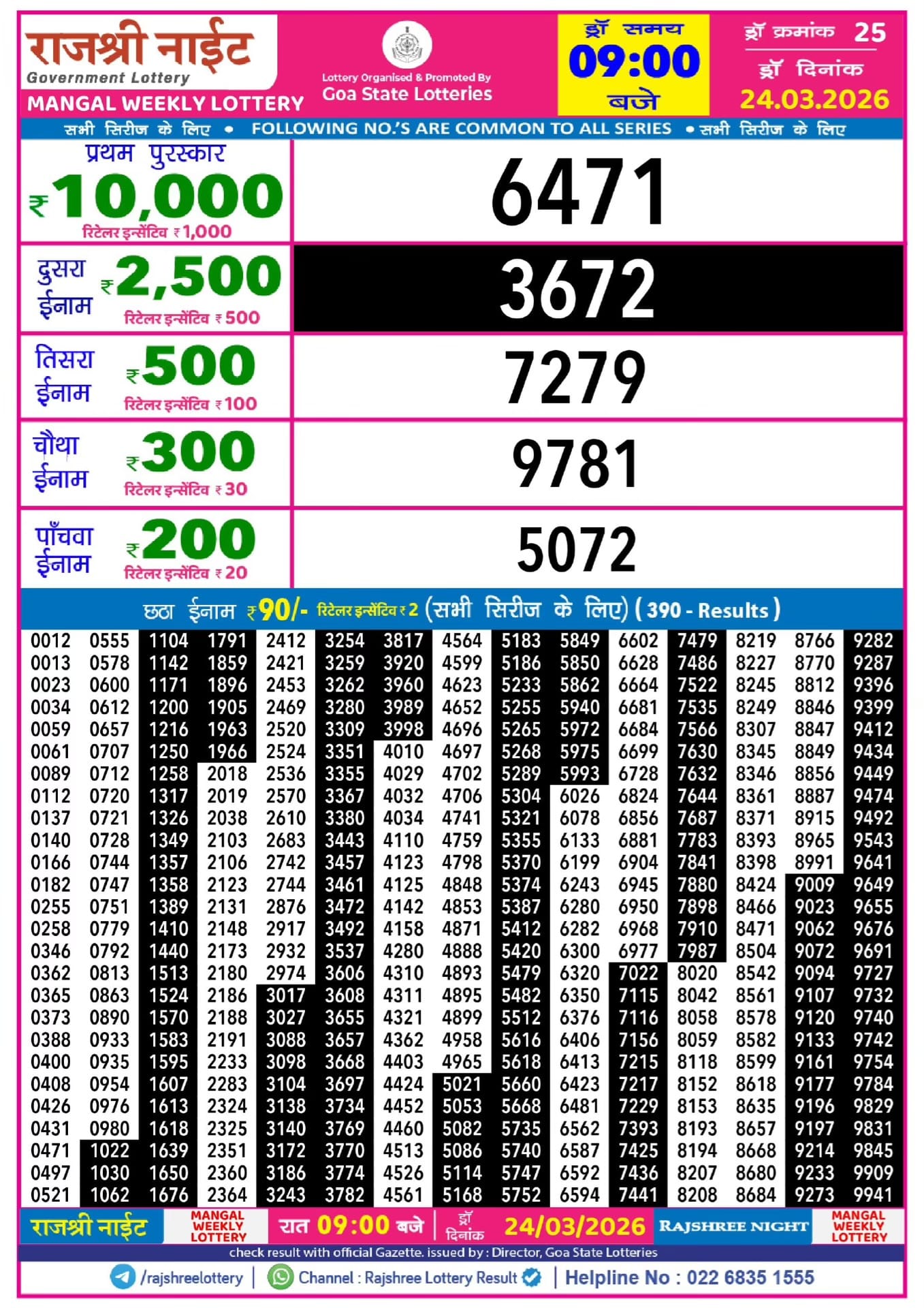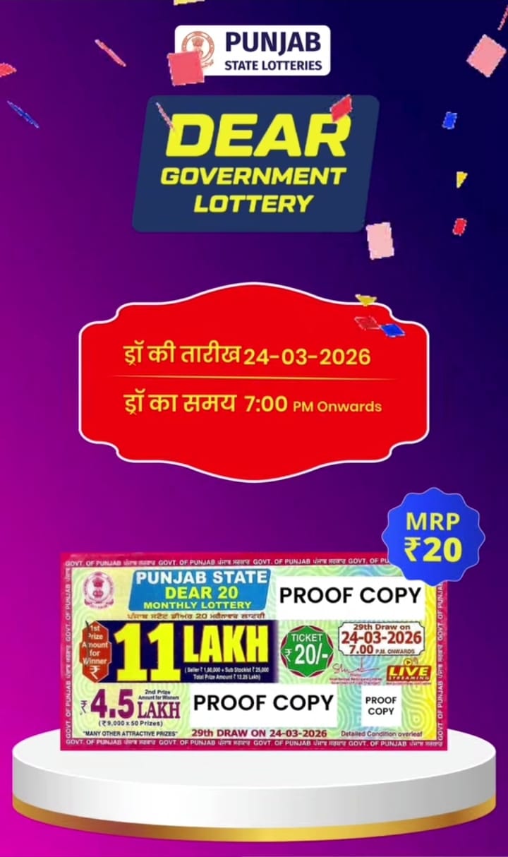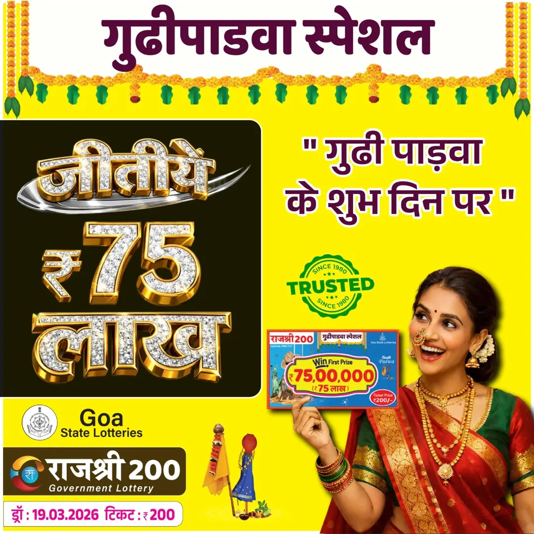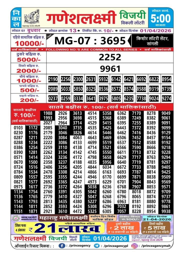 Maharashtra Ganeshlaxmi Vijayee Weekly Draw 01.04.2026 Result 5 PM 0 Likes 42 Views Related Articles 0 65Punjab State Dear 20 Monthly Lottery 24 March 2026 At 7 PM 5 289Rajhsree 200 Monthly Lottery 19.3.2026 Result 6.30 PM Onwards (Gudipadwa Special) 0 66Punjab State Dear 50 Ranger Sunday 6pm Lottery Result 18.01.2026 0 40Rajshree Night Mangal Weekly Lottery 24.03.2026 Result 9 PM