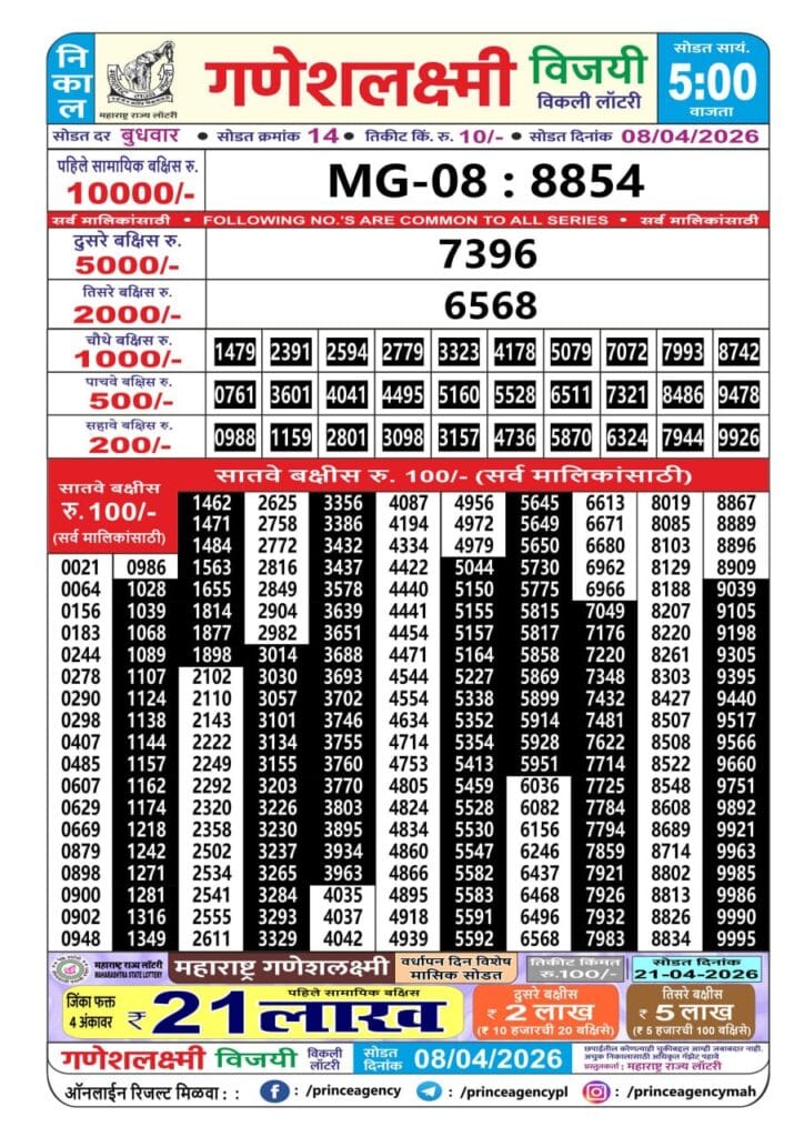 Maharashtra Ganeshlaxmi Vijayee Weekly Draw 08.04.2026 Result 5 PM 0 Likes 29 Views Related Articles 0 70Rajshree Night Budh Weekly Lottery 18.03.2026 Result 9 PM 0 45Rajshree Tuesday Weekly Lottery 24.02.2026 Result 8 PM 0 130Rajshree 200 Monthly Lottery 19.03.2026 Result 6.30 PM 0 86Maharashtra Mohini Weekly Draw 04.01.2026 Result 4.30pm