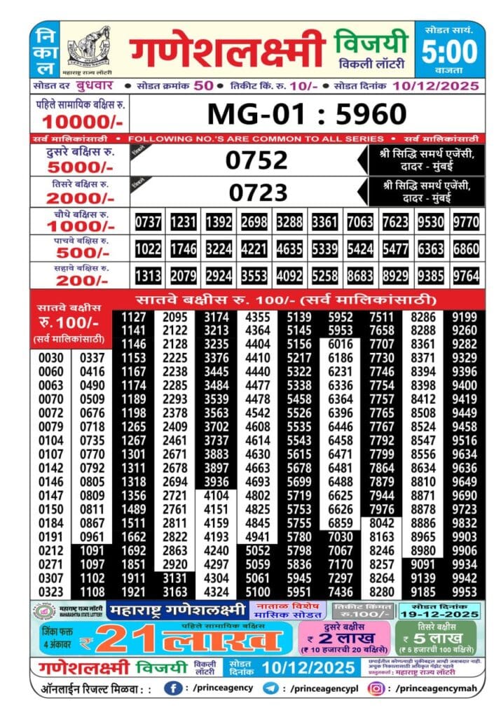 Maharashtra Ganeshlaxmi Vijayee Weekly Draw 10.12.2025 Result 5pm 0 Likes 51 Views Related Articles 0 55Punjab State Dear 50 Bronco Tuesday 6pm Lottery Result 11.11.2025 0 56Rajshree ravi Weekly Lottery 1PM Result 20.07.2025 2 94Punjab State Dear 200 Monthly Lottery Draw On Saturday, 2 August 2025 At 8 PM 0 68Punjab State Dear 50 Jackal Saturday 6pm Lottery Result 11.10.2025
