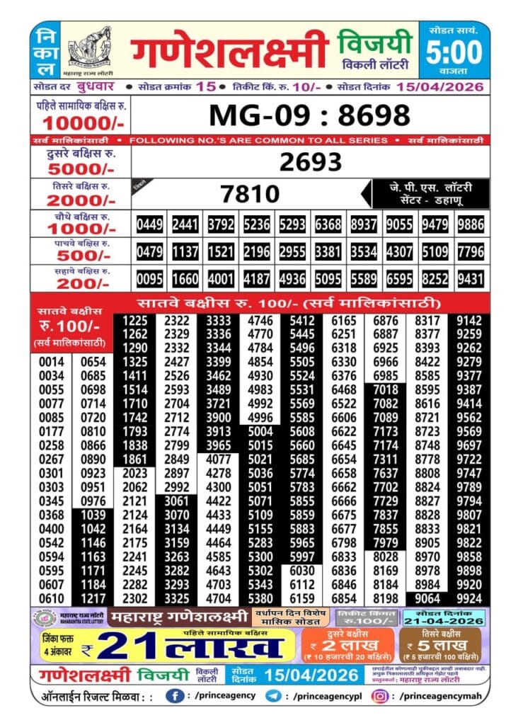 Maharashtra Ganeshlaxmi Vijayee Weekly Draw 15.04.2026 Result 5 PM